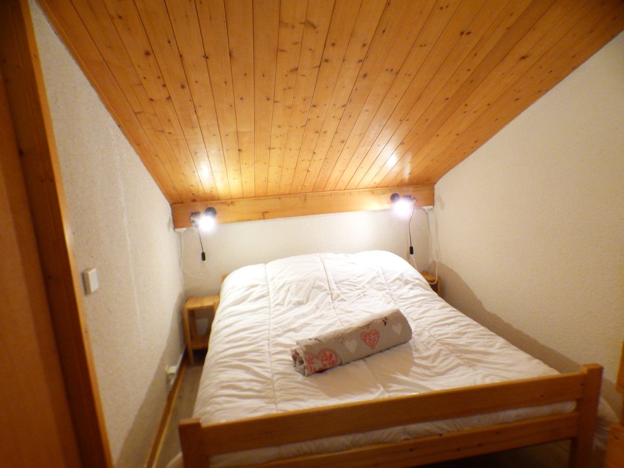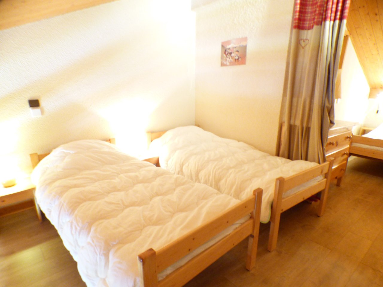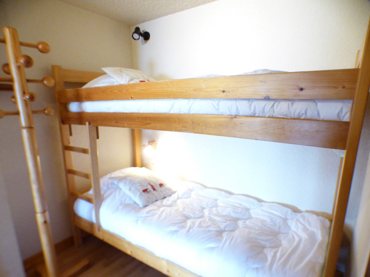 The apartment has a living room with an open fully-equipped kitchenette, an alcove with 2x90 bunk beds (NB: the top bunk is not suitable for children under 6 years old), a mezzanine with two areas separated by a curtain, the with a 140cm bed (and en suite bathroom) and the second with two 90cm beds, a shower room and separate wc.