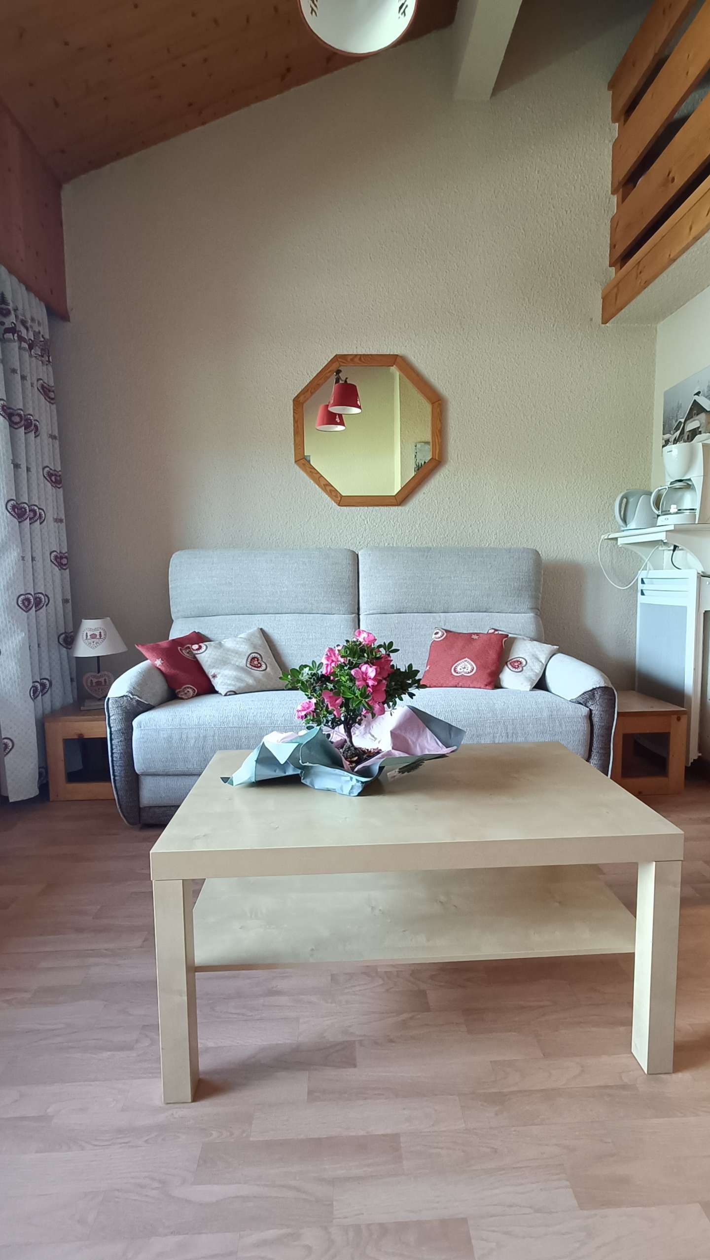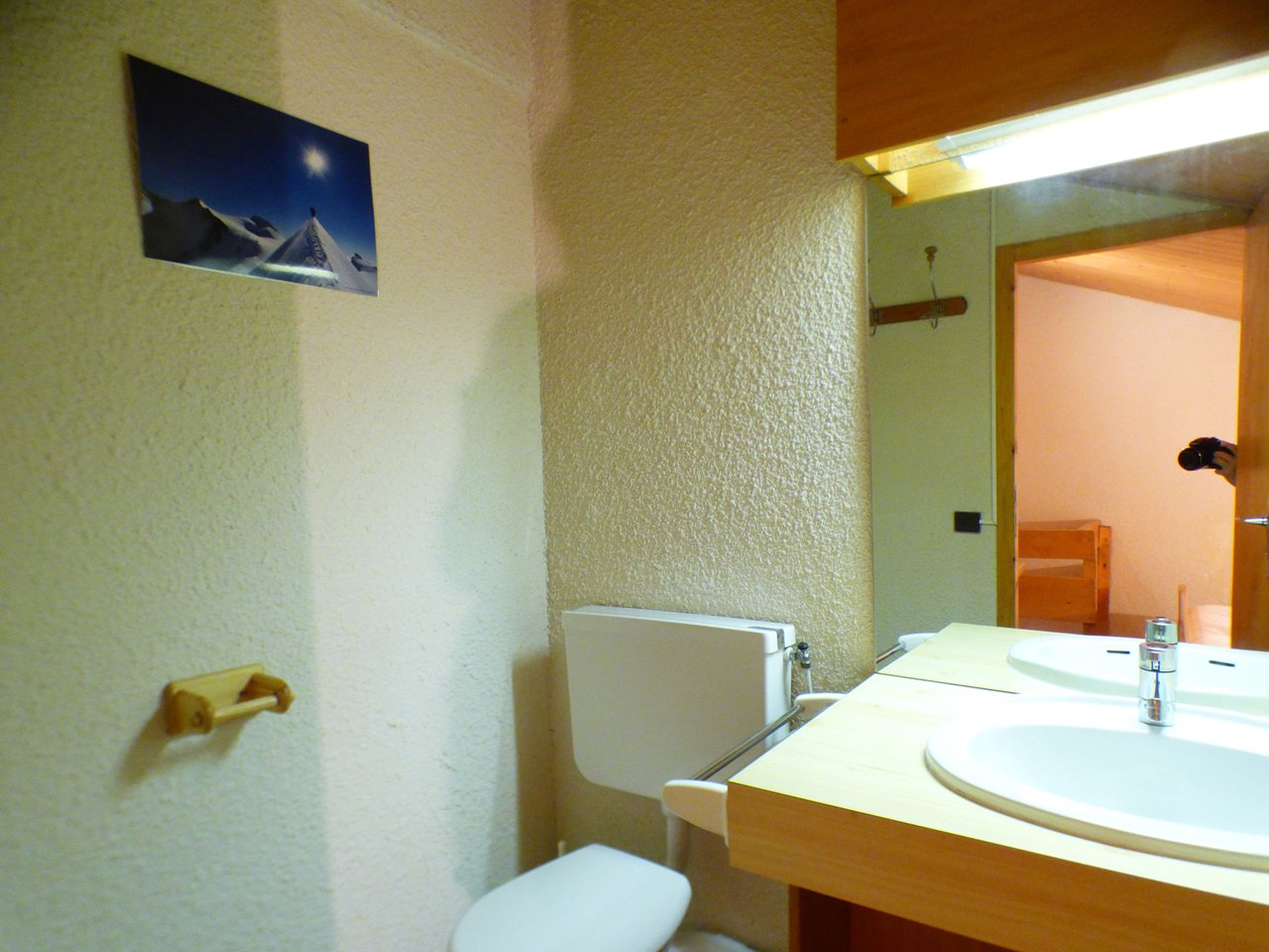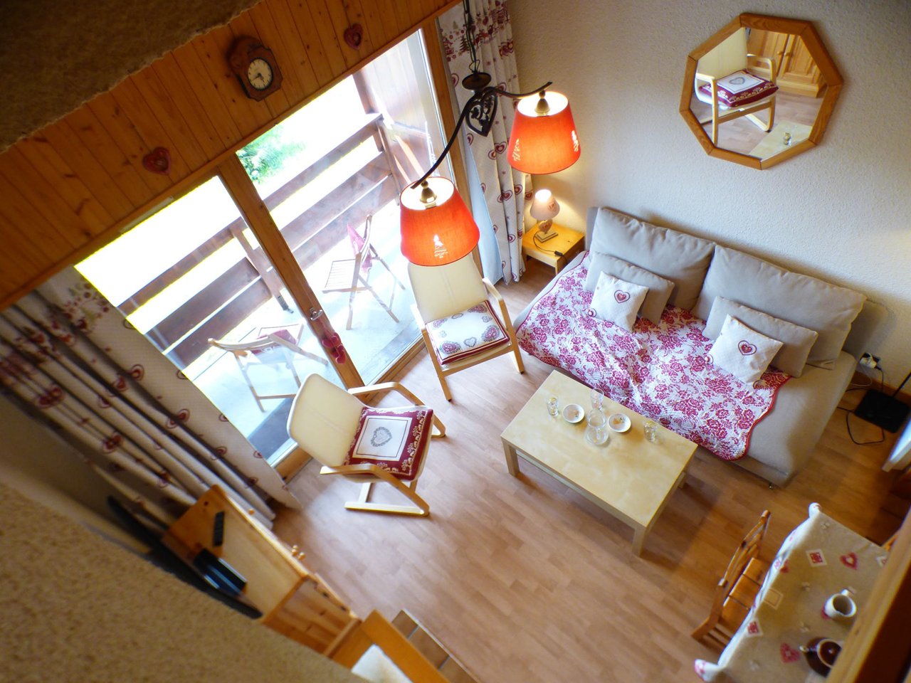The apartment has a living room with an open fully-equipped kitchenette, an alcove with 2x90 bunk beds (NB: the top bunk is not suitable for children under 6 years old), a mezzanine with two areas separated by a curtain, the with a 140cm bed (and en suite bathroom) and the second with two 90cm beds, a shower room and separate wc.
