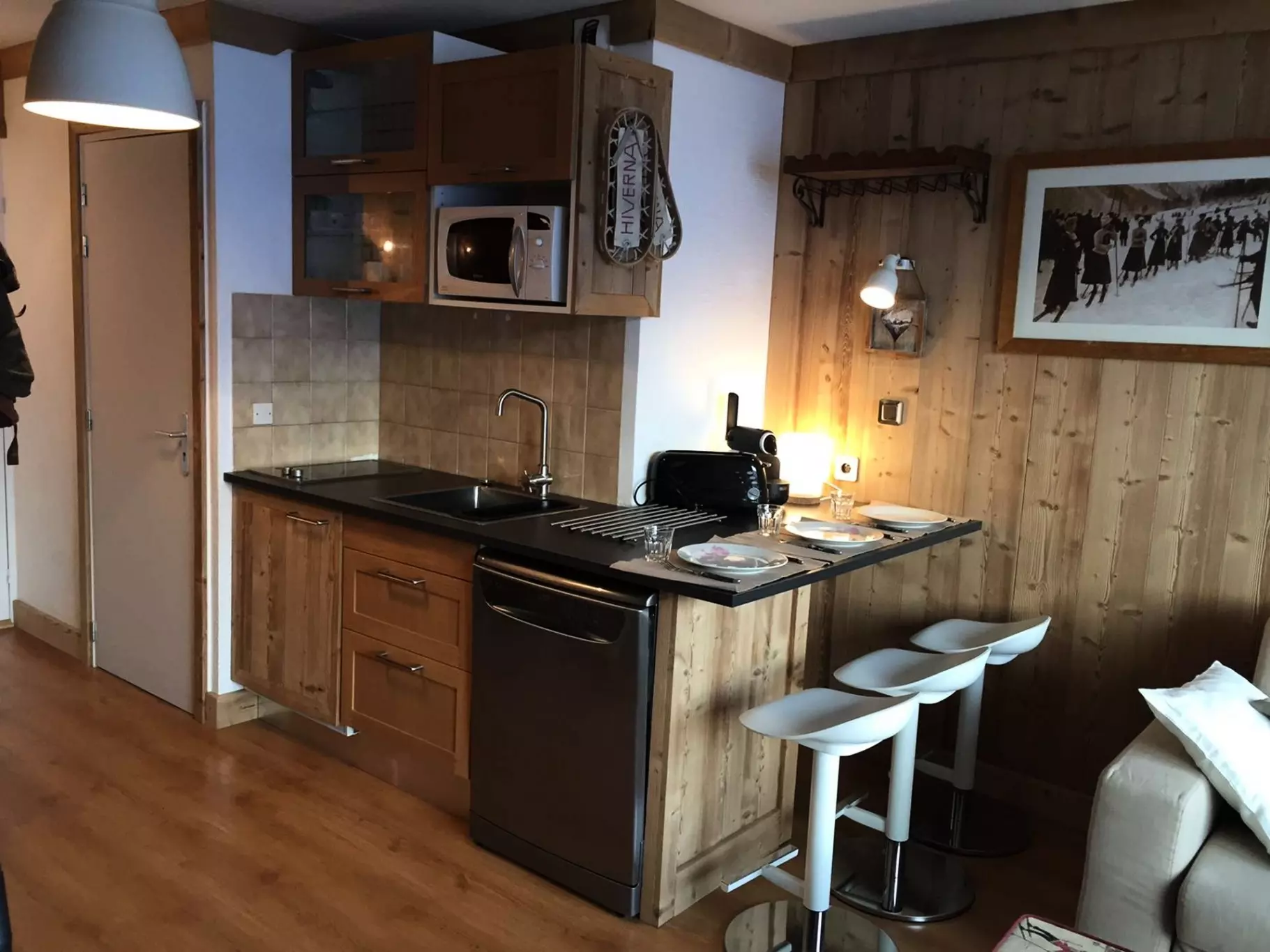 Fully equipped kitchenette for 3 people with ceramic hob, 1 microwave, 1 refrigerator, 1 dishwasher, 1 NESPRESSO coffee machine, 1 kettle and 1 toaster.