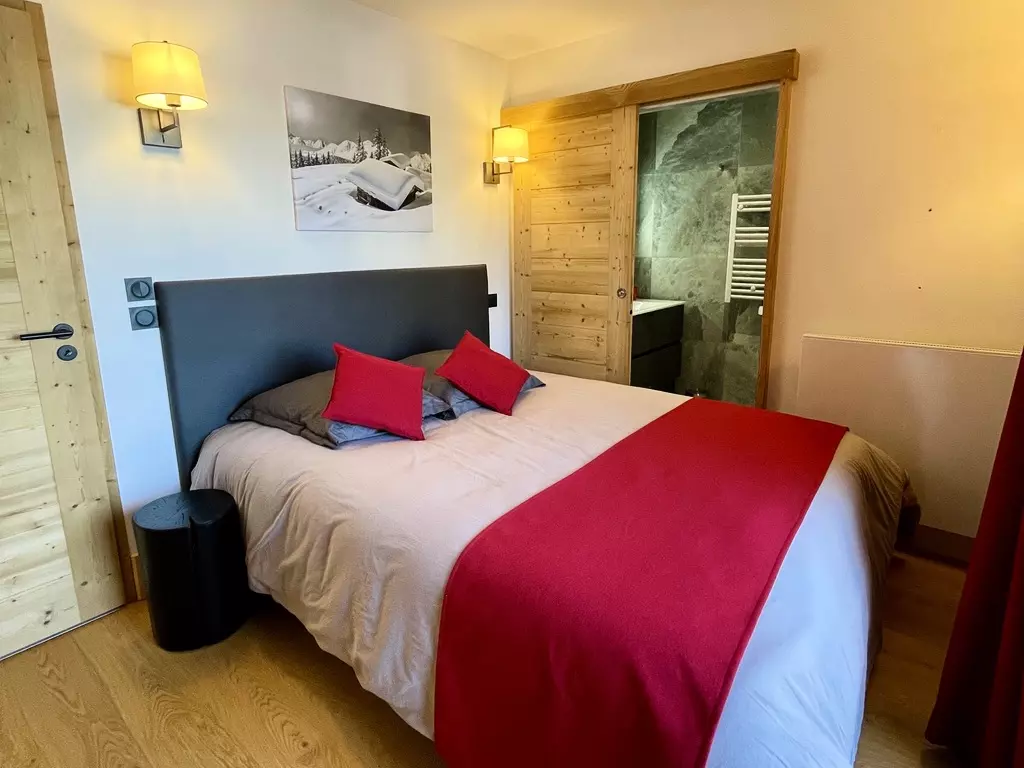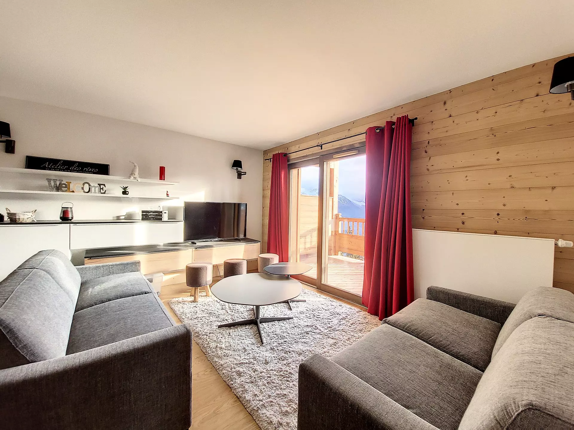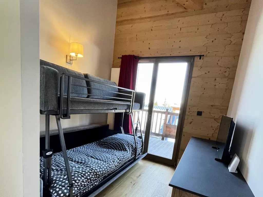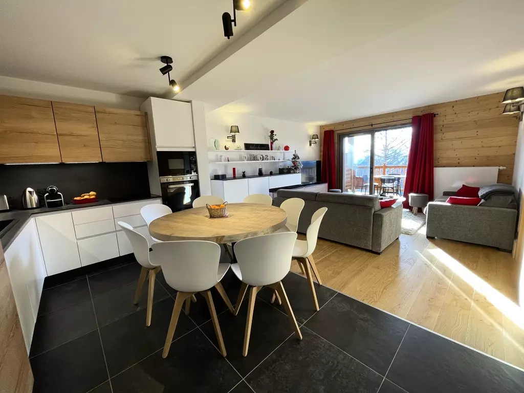 Spacious, warm, and welcoming 100m² apartment with a contemporary, cozy Alpine style. The living room will charm you with its brightness and its opening onto a south-facing terrace facing Mont Pourri.