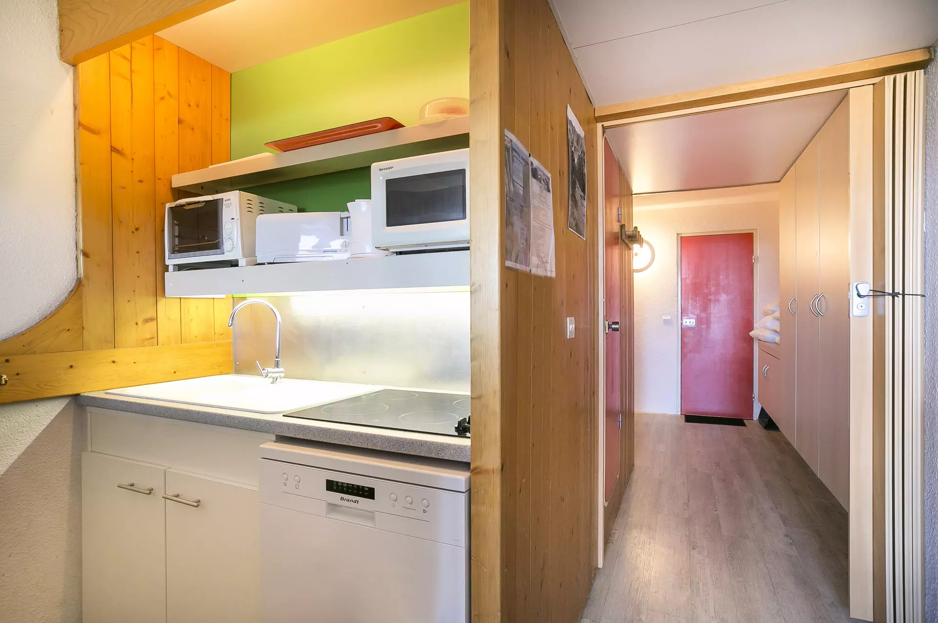 Kitchen area including: 4 ceramic hobs, microwave, mini oven, refrigerator, dishwasher, kettle, filter coffee maker, Senséo coffee maker, and toaster.
