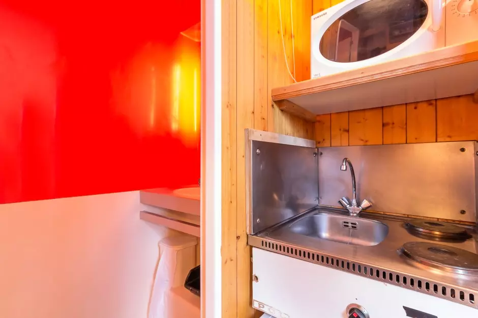 Kitchenette including: 2 electric hotplates, microwave, refrigerator and a filter coffee maker