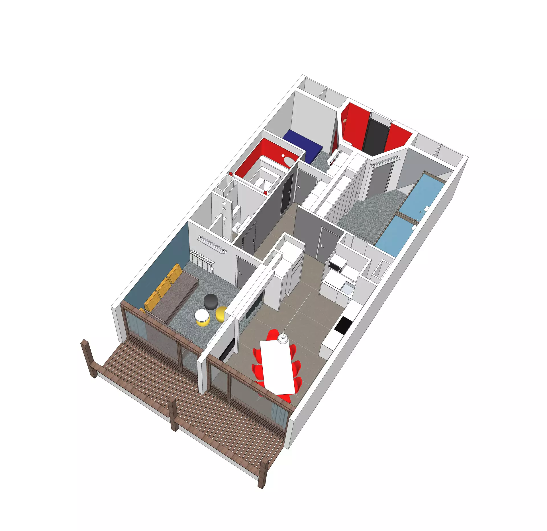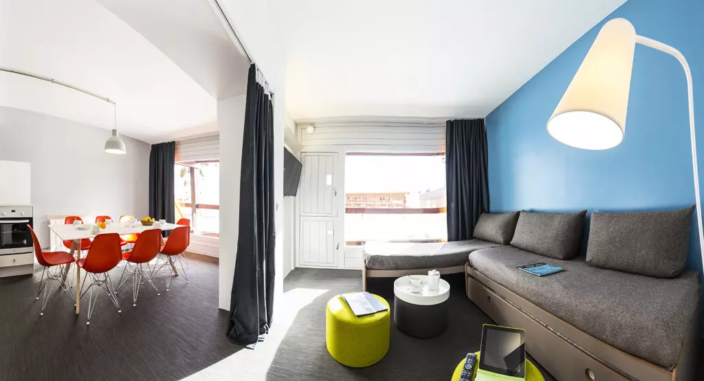 Renovated and colorful 3-room apartment, 61m² for 8 people, located on the 1st floor of the Aiguille Rouge residence, 2 balconies facing South-East