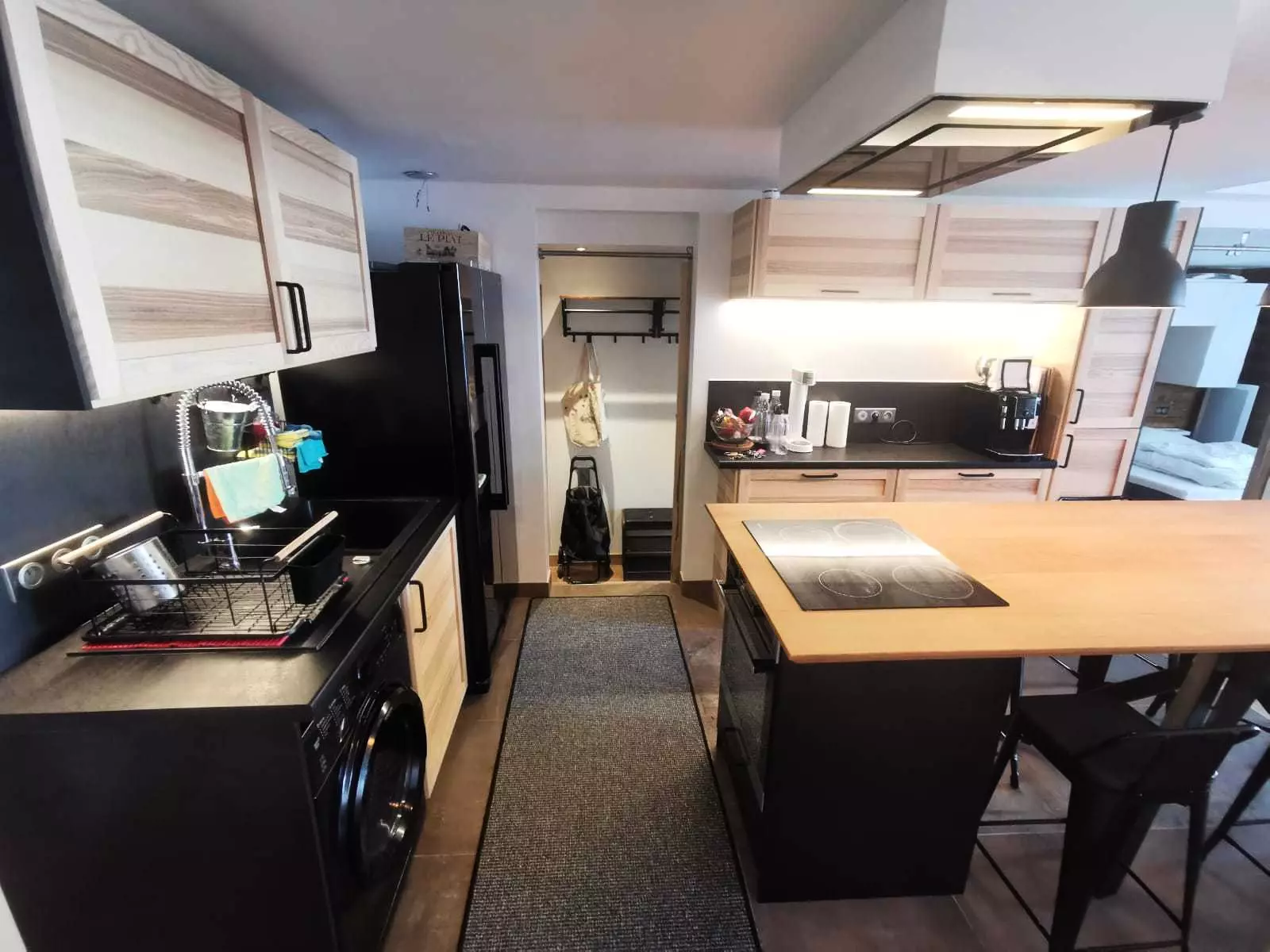 Kitchen including: traditional oven, microwave, toaster, kettle, electric coffee maker, induction hob and fridge/freezer