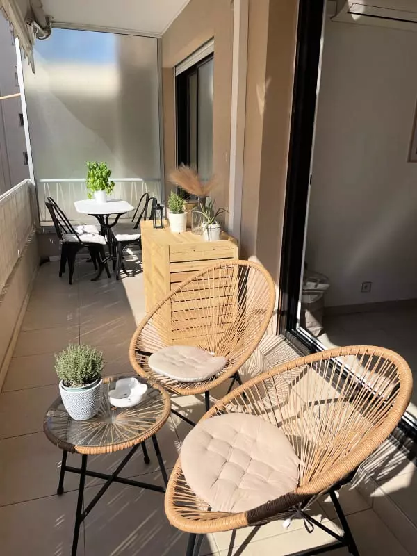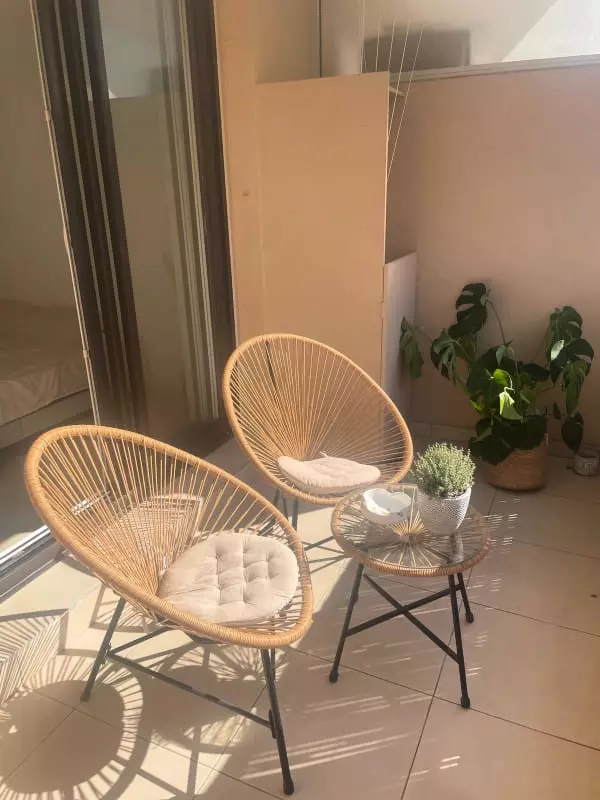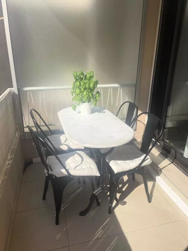 A 10 m² balcony, accessible from the living room and the master bedroom, with a small table for two people