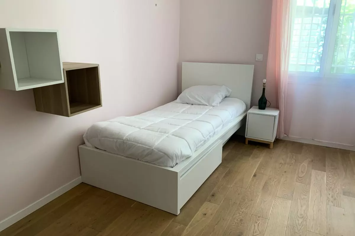 - a bedroom with a single bed;