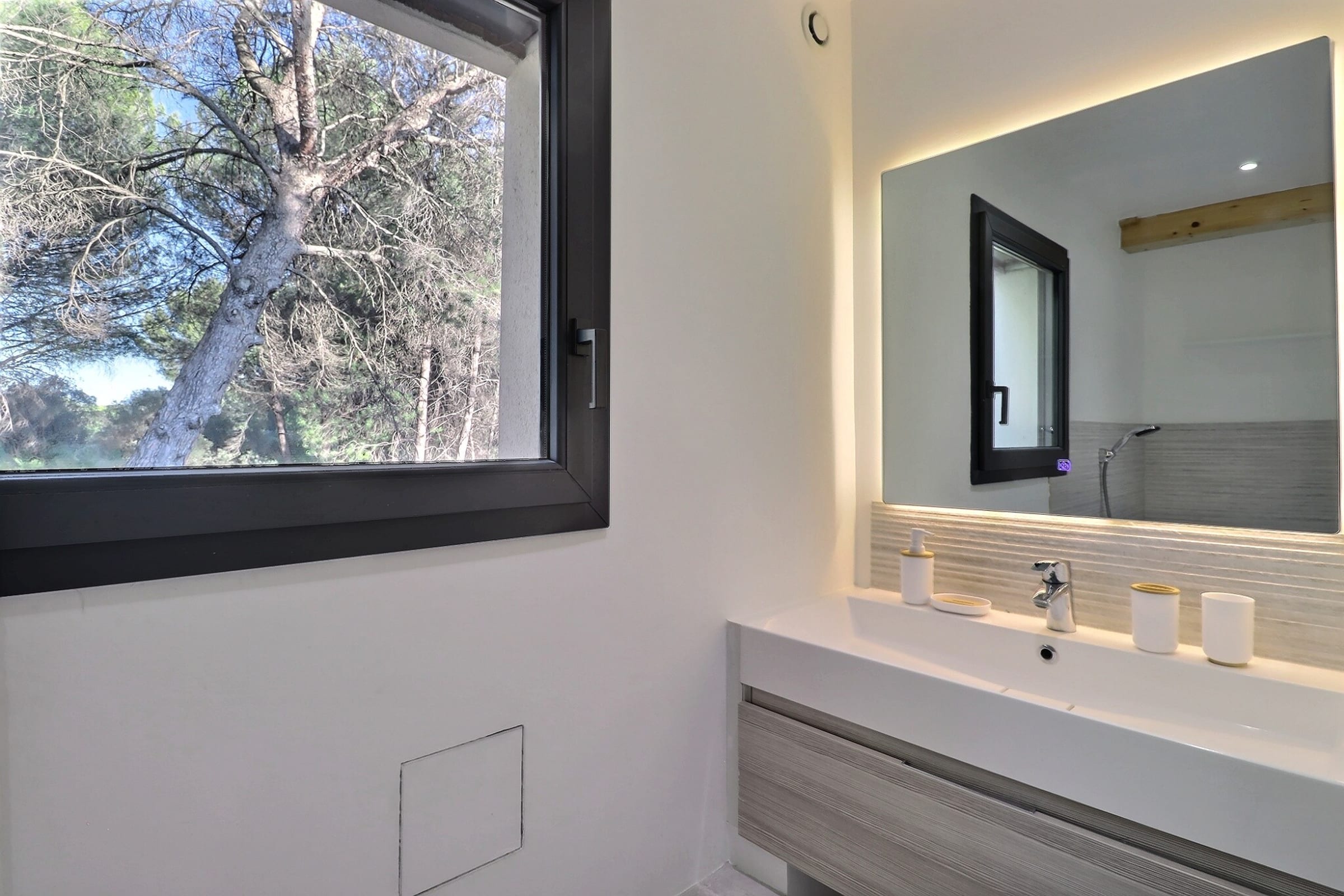 In the main house, the bright living room, fully equipped open-plan kitchen, and dining area come together to create a generous and welcoming living space, opening directly onto the landscaped garden and the infinity pool. The entire space enjoys abundant natural light thanks to large bay windows overlooking the outdoors.