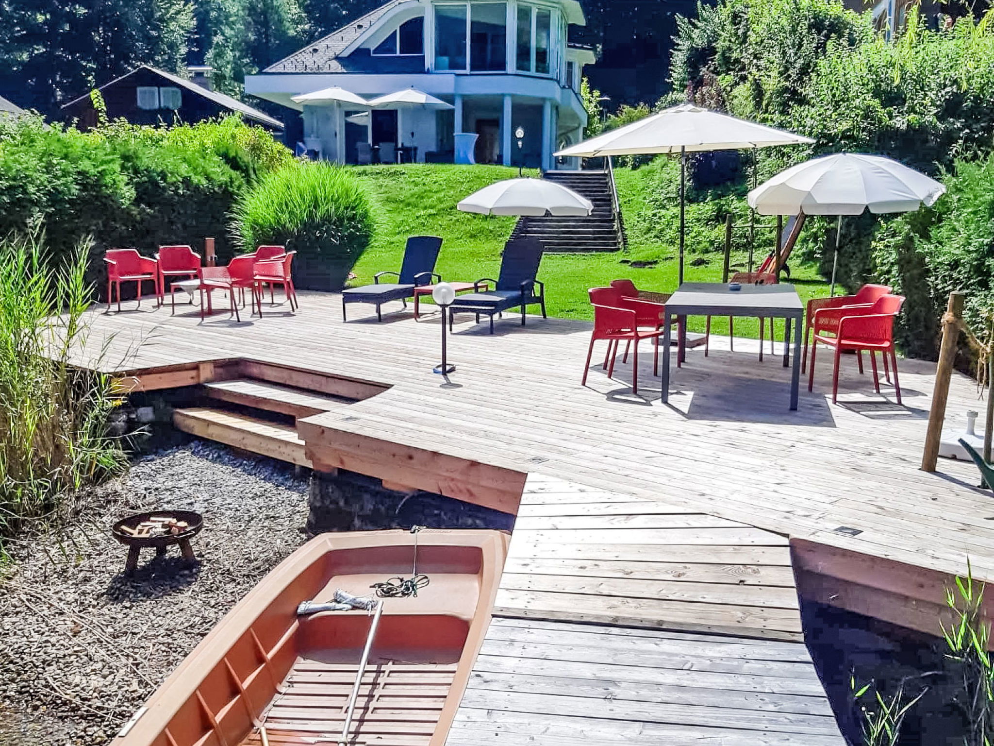 Villach: Modern villa "Villa Ossiacher Südufer". On the outskirts, in a quiet position, on the lake, 5 km from the skiing area, direct access to the beach. Private: property 1'300 m2 (fenced), garden 500 m2. Bathing jetty. In the house: central heating system. Rowing boat (Local agreement), roofed, parking (for 3 cars) at the house. Supermarket 5 km, restaurant 2 km, bakery 6 km, bus stop "St. Andrä Gemeindebad" 300 m, railway station "Annenheim" 5 km, thermal baths "Kärntentherme" 12 km. Marina 1.3 km, golf course (18 hole) 16 km, surf school 4 km, skisport facilities 5 m, ski rental 5 km, ski bus stop 300 m, ski school 5 km. Nearby attractions: Familywald Waldachterbahn 7 km, Burg Landskron/Affenberg 4 km, Pyramidenkogel 33 km, Villach 8 km. Well-known ski regions can easily be reached: Gerlitzen 16 km. Well-known lakes can easily be reached: Ossiachersee, Wörthersee 16 km. Hiking paths: Gerlitzen 16 km.