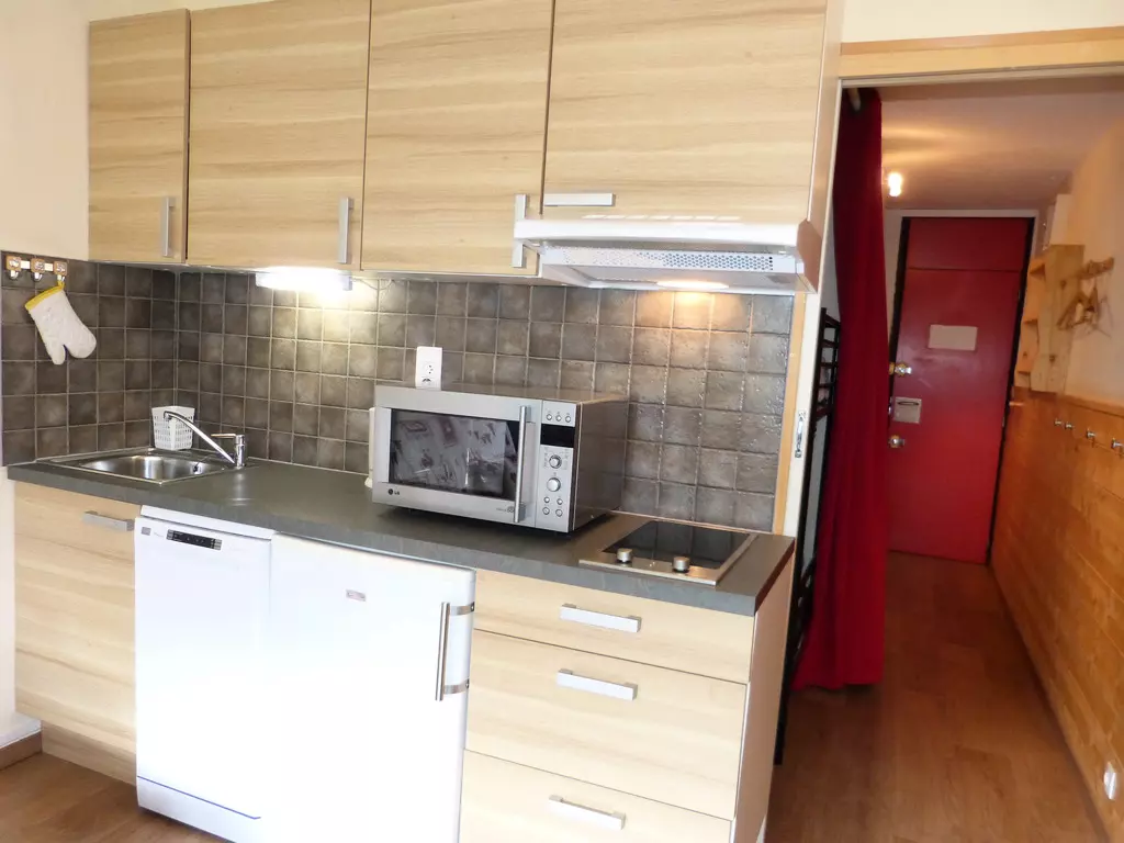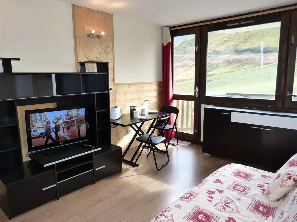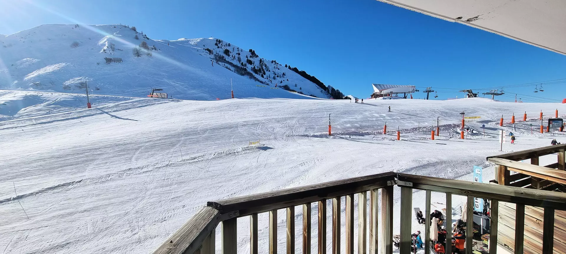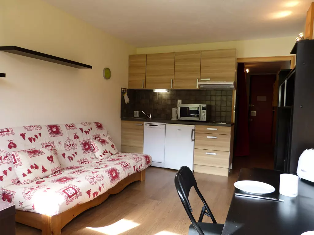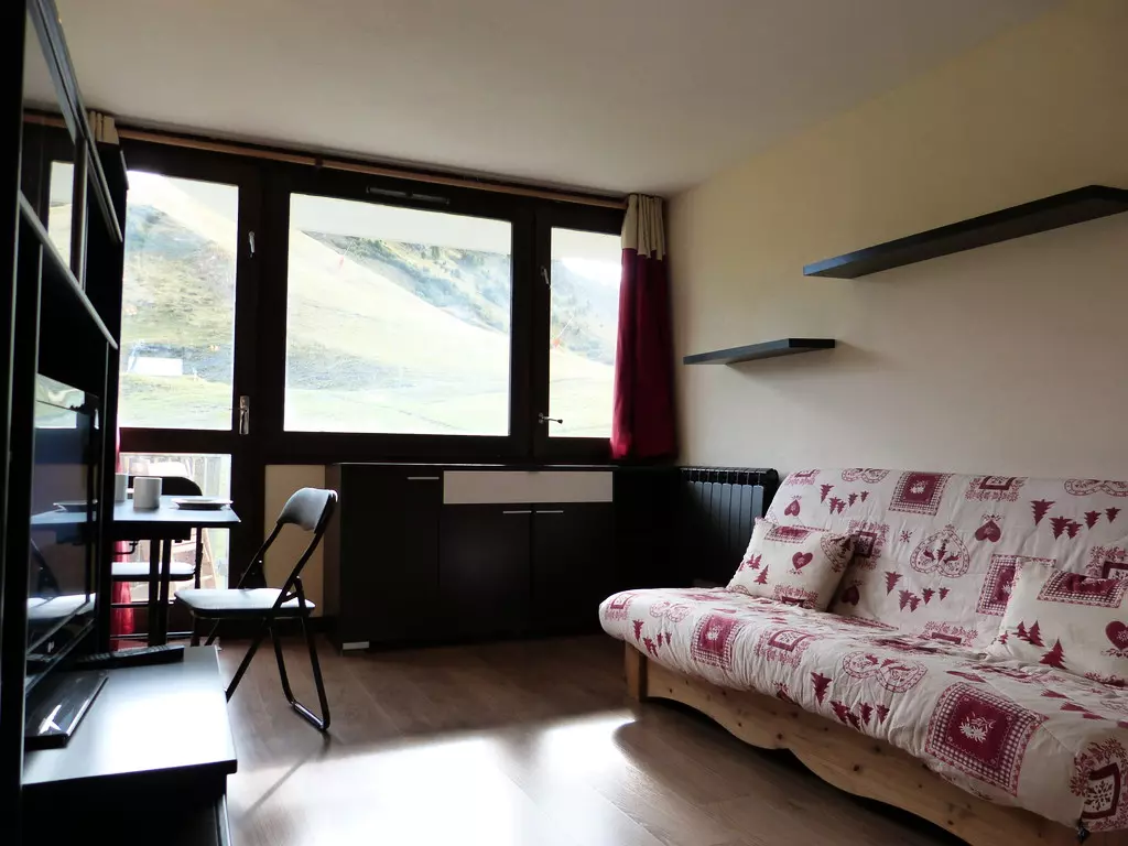 This studio is located on level "H" of the Paquebot des Neiges and is accessible by the "Zénith" elevator. It consists of a living room with an open kitchen, a cabin, and a bathroom with a toilet. Its south-facing balcony offers a beautiful view of the slopes.