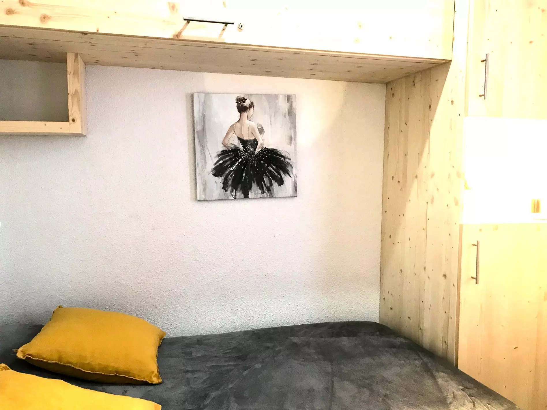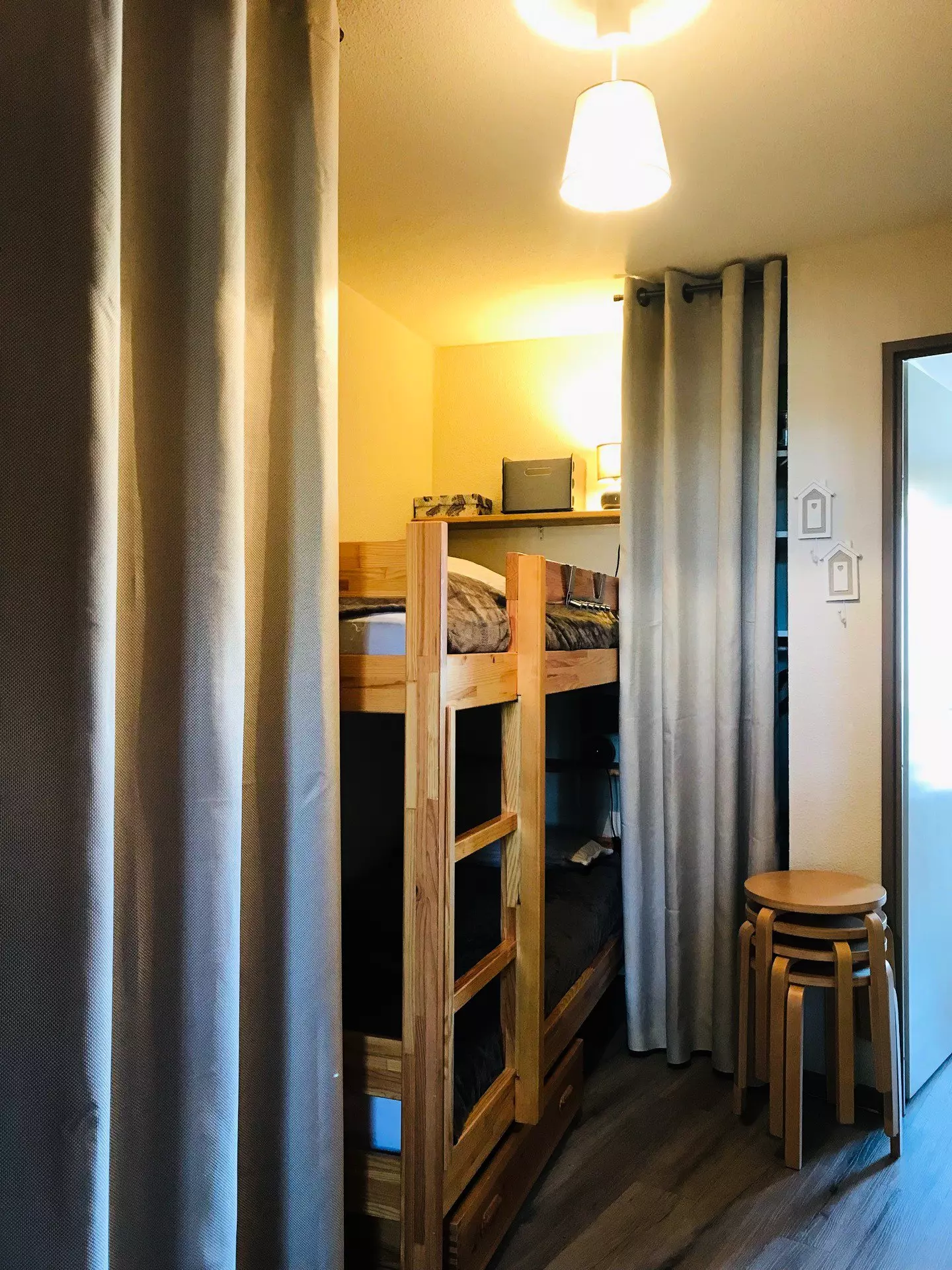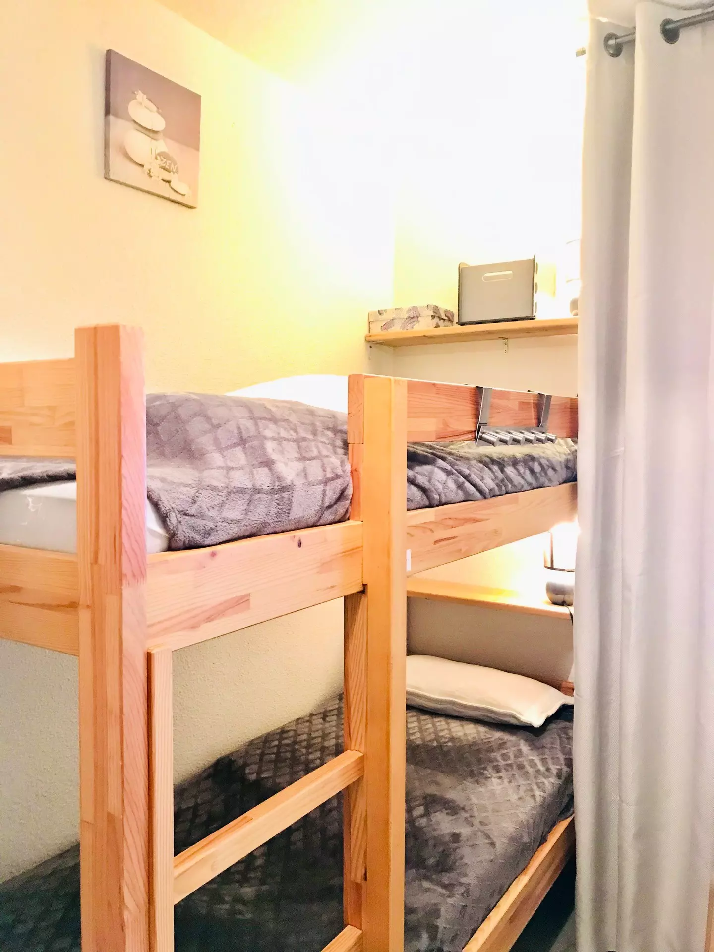 The mountain corner has 2 bunk beds (not suitable for children under 6 years old) and the bedroom has 1 double bed as well as 1 TV + DVD player.