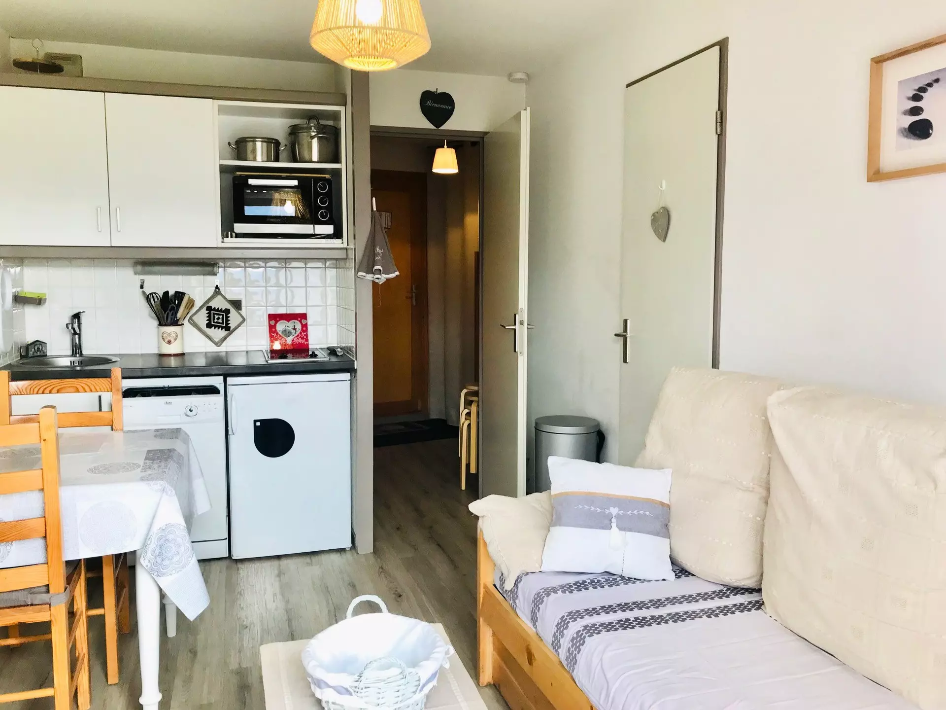 The kitchen area is equipped with a refrigerator, 2 electric hotplates, a mini oven, a microwave, a kettle, coffee makers, a dishwasher and a toaster; opens onto a bright living room including a dining area, 1 sofa, 1 flat screen TV.