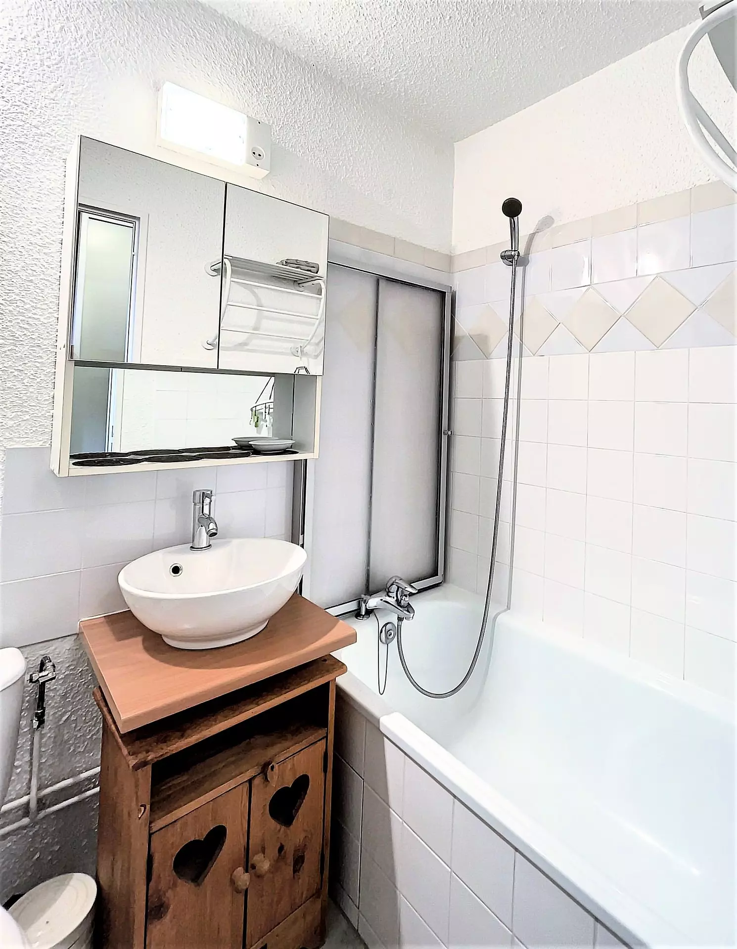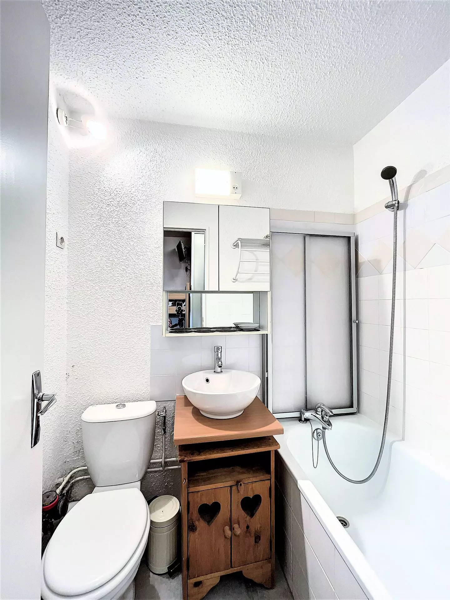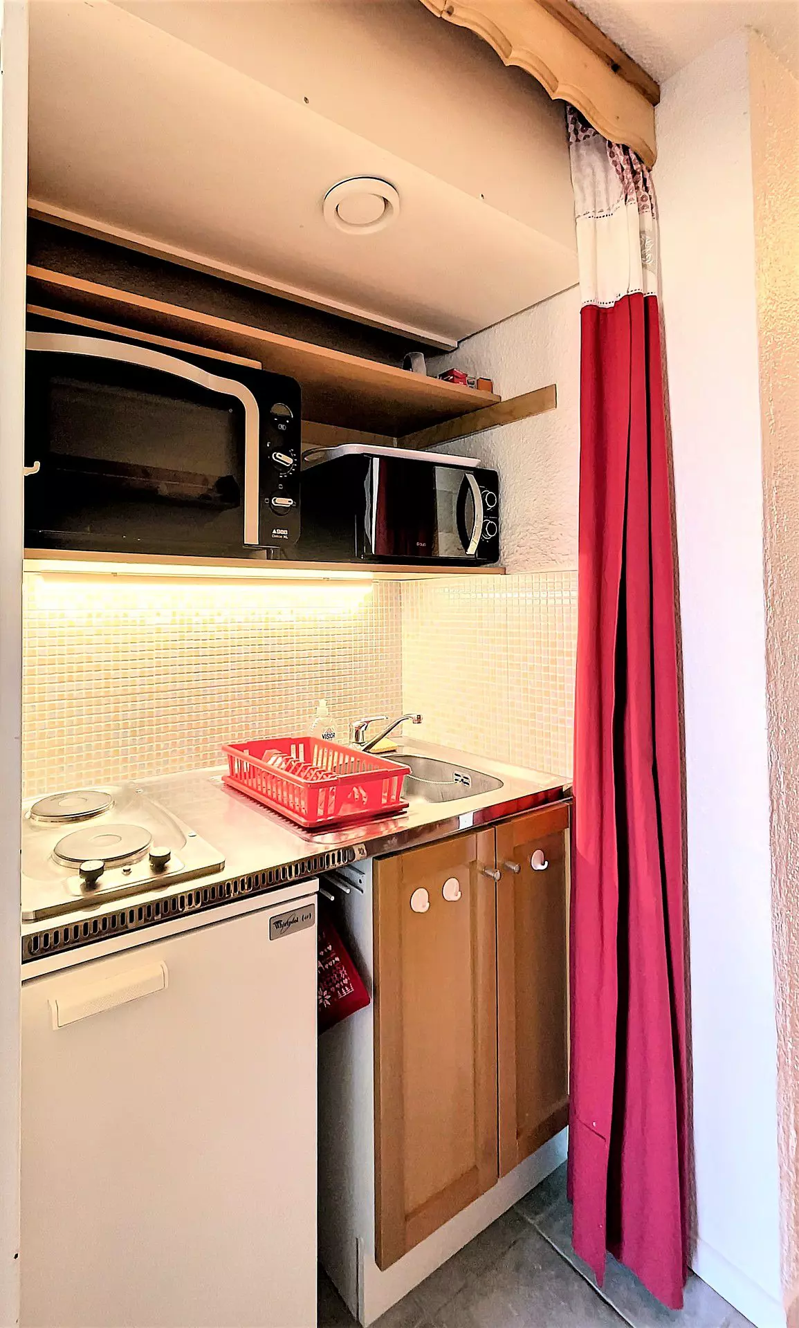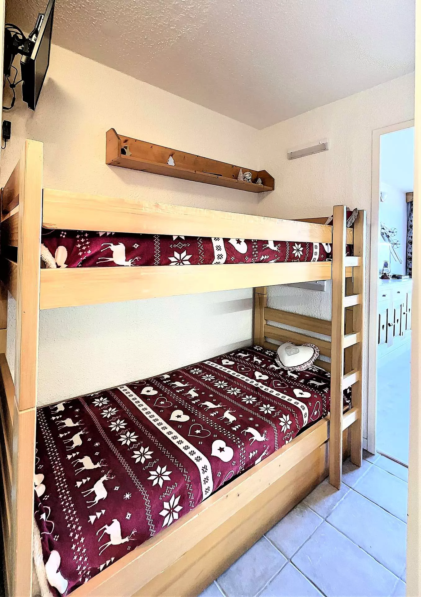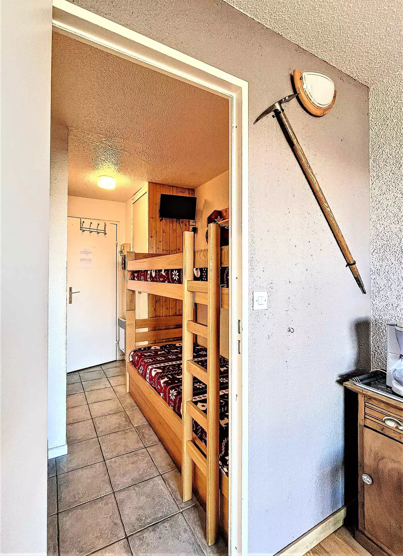 Studio comprising an entrance with storage cupboard, a bathroom with toilet, 2 bunk beds and a kitchen area equipped with 2 electric hotplates, a top fridge, a microwave oven, mini oven, a filter coffee maker.... The living room is equipped with 1 BZ sofa bed offering a 140 cm bed, plenty of storage space, a round table, a flat screen television and a DVD player.