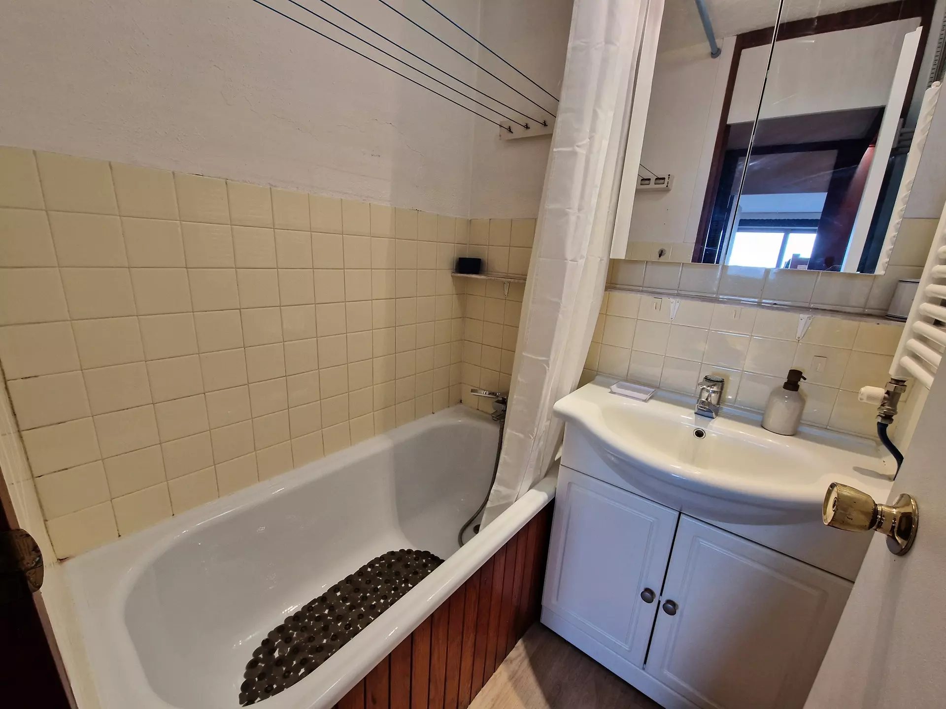 The bathroom consists of a sink, a bathtub and a toilet.