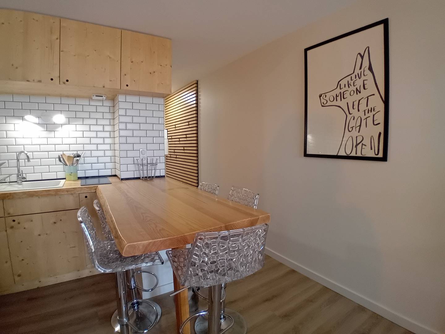 The kitchen area is equipped with a high table, two-burner ceramic hob, refrigerator, and microwave.