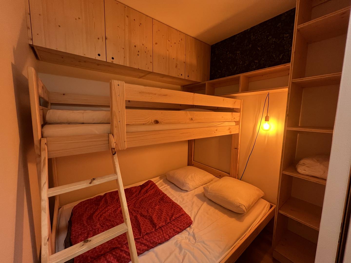 The cabin-style bedroom (without window) is cleverly arranged with a double bed (140 cm) topped with a single bunk bed, making it ideal for a couple with one child. The bathroom includes a bathtub, washbasin, and WC.