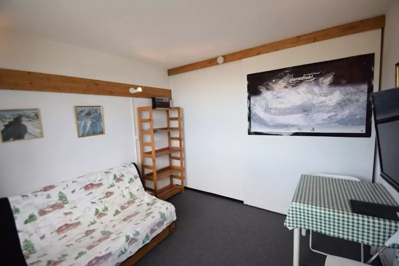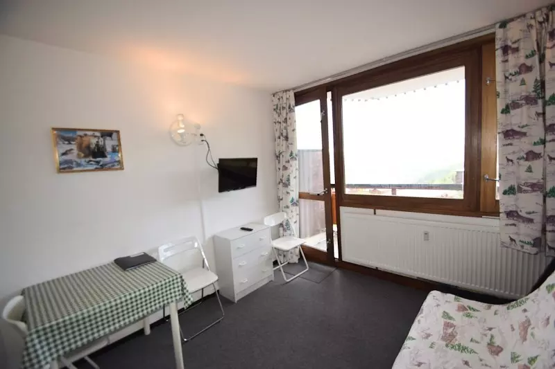 Studio 15m2 for 2 people, balcony facing north, view of the valley and Mont Blanc on the 6th floor with elevator. Kitchen: in entrance/corridor: 2 electric hotplates, microwave grill, refrigerator, electric coffee maker. Living room (separated from the corridor by a sliding partition): BZ sofa bed for 2 people (140cm), dining area, television - Bathroom: shower cubicle, WC included. Floors: plastic except living room: carpet - Bedding: 1 double duvet