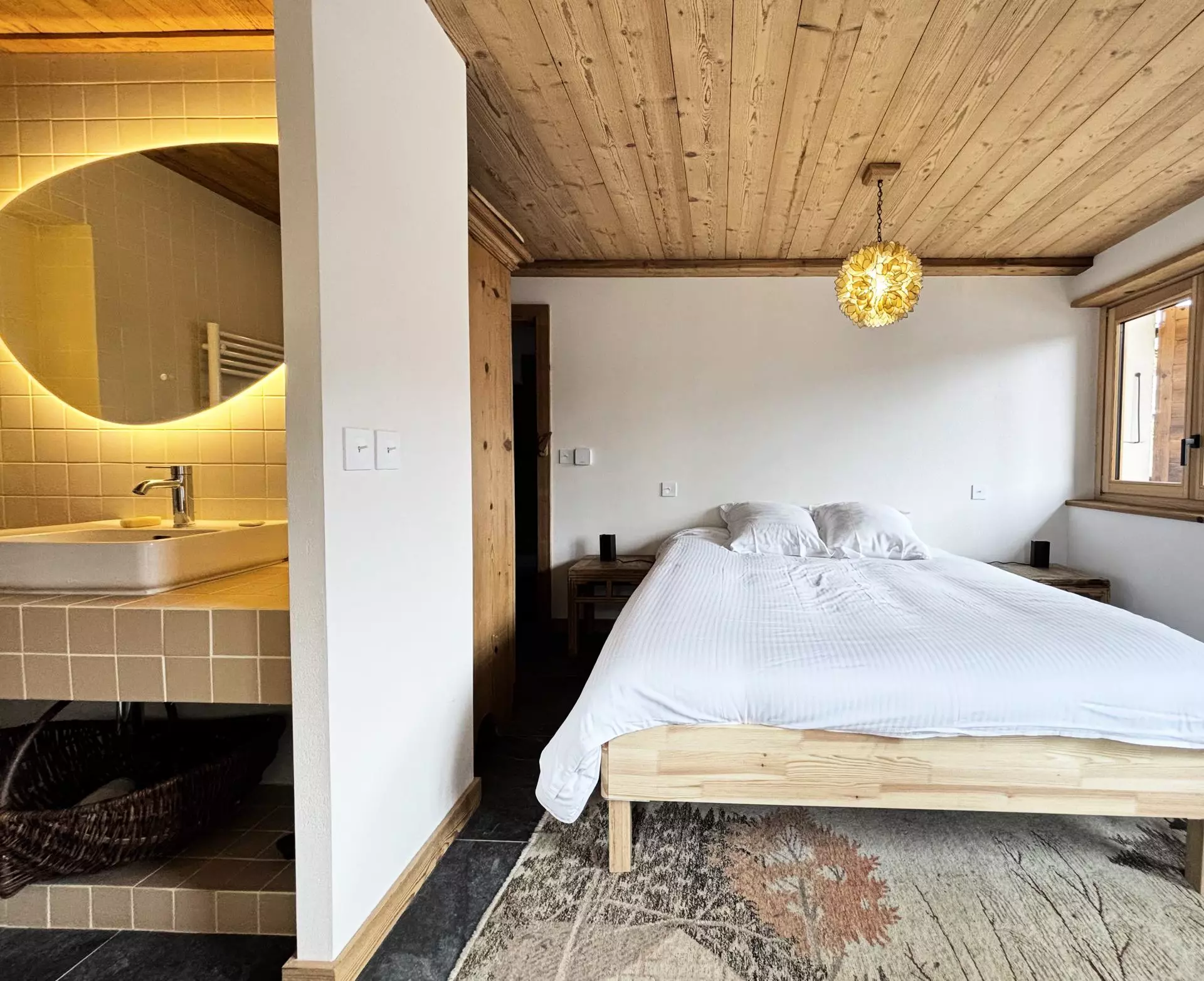 This level opens onto a southwest-facing balcony, bathed in natural light and ideal for moments of relaxation overlooking the alpine landscape.