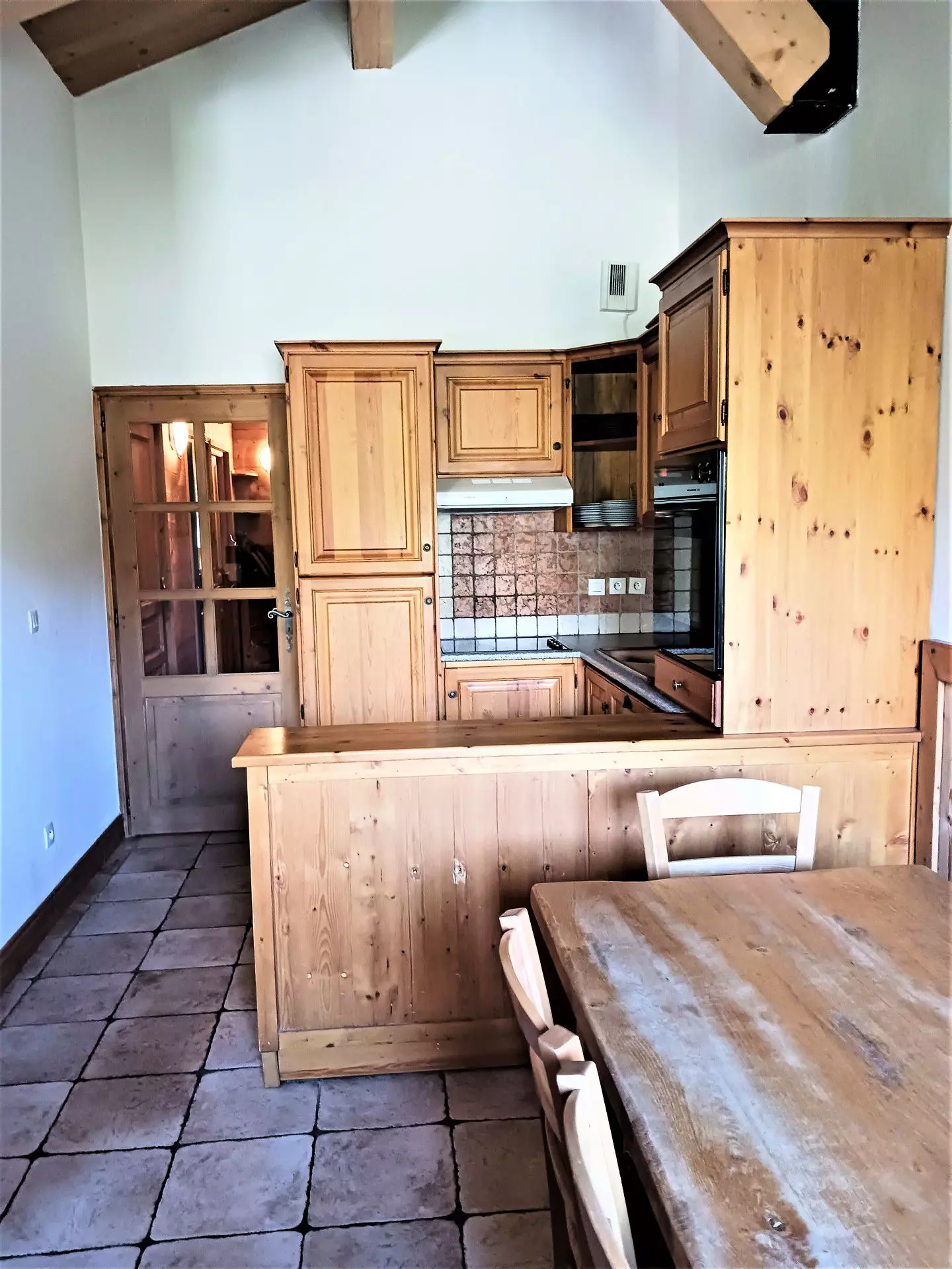 It is equipped with ceramic hobs, an oven, a microwave, a dishwasher and a fridge with freezer.