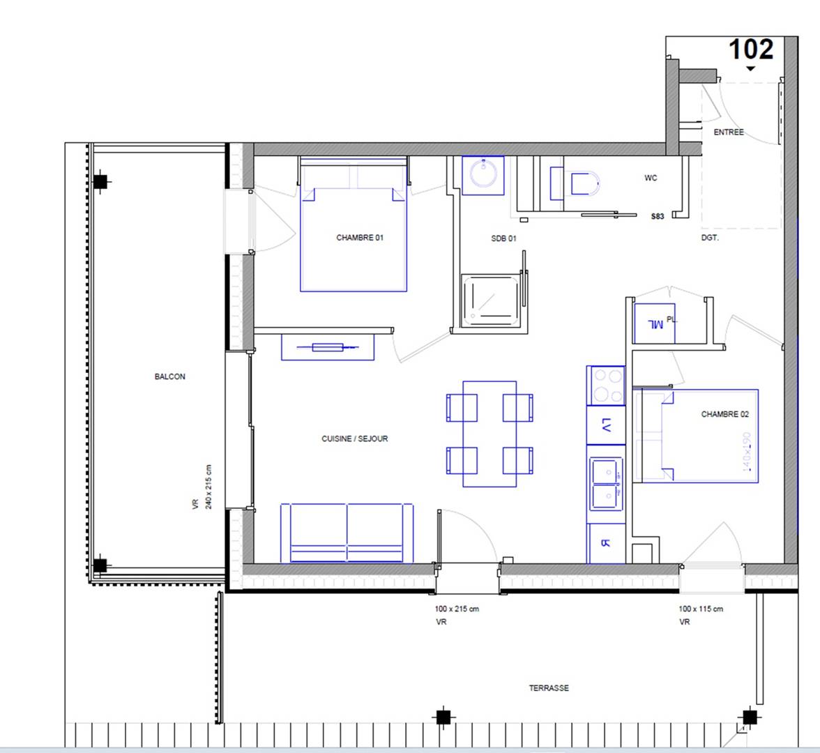 The apartment consists of a living room opening onto a 20m² south-facing terrace and a 12m² south-west facing balcony.