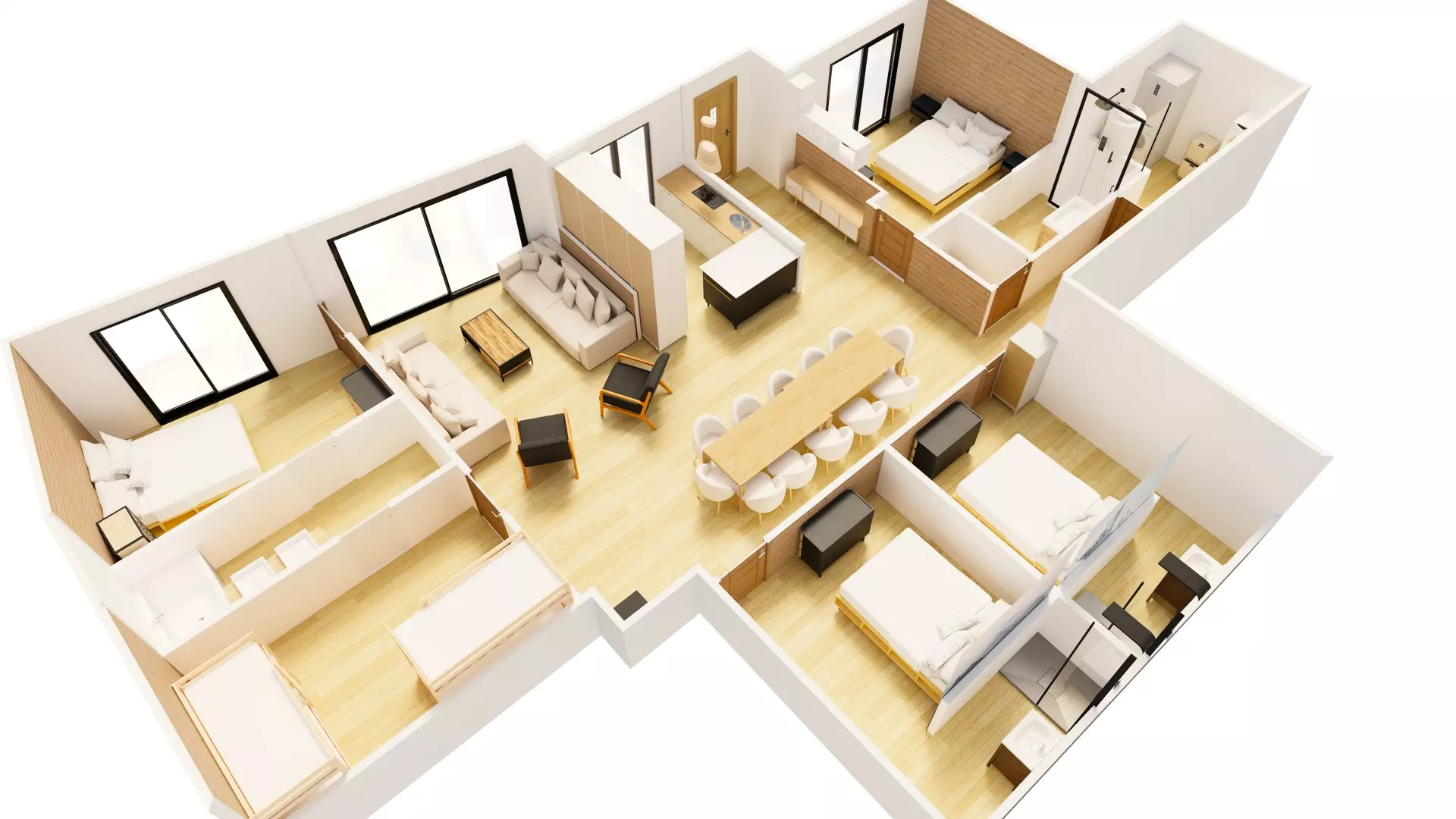 - Kitchen area: oven, microwave, refrigerator, induction hob (4 burners), dishwasher.