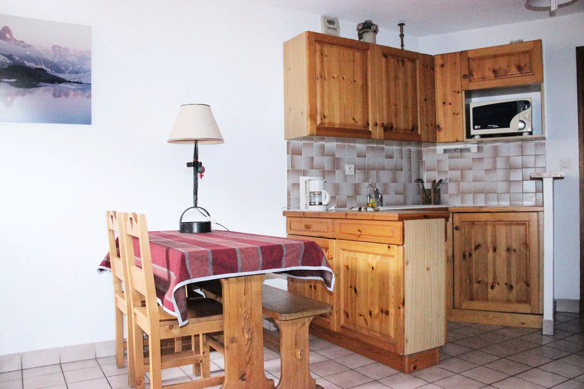 Kitchen area: electric hob, microwave and refrigerator.