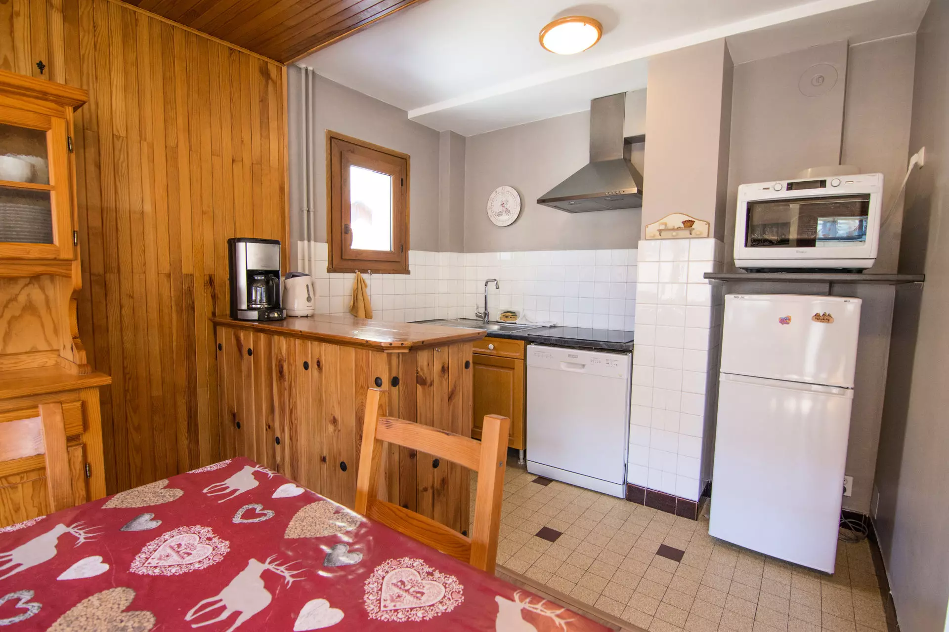 - Kitchen area: microwave/grill, dishwasher, ceramic hob (3 burners), fridge/freezer.