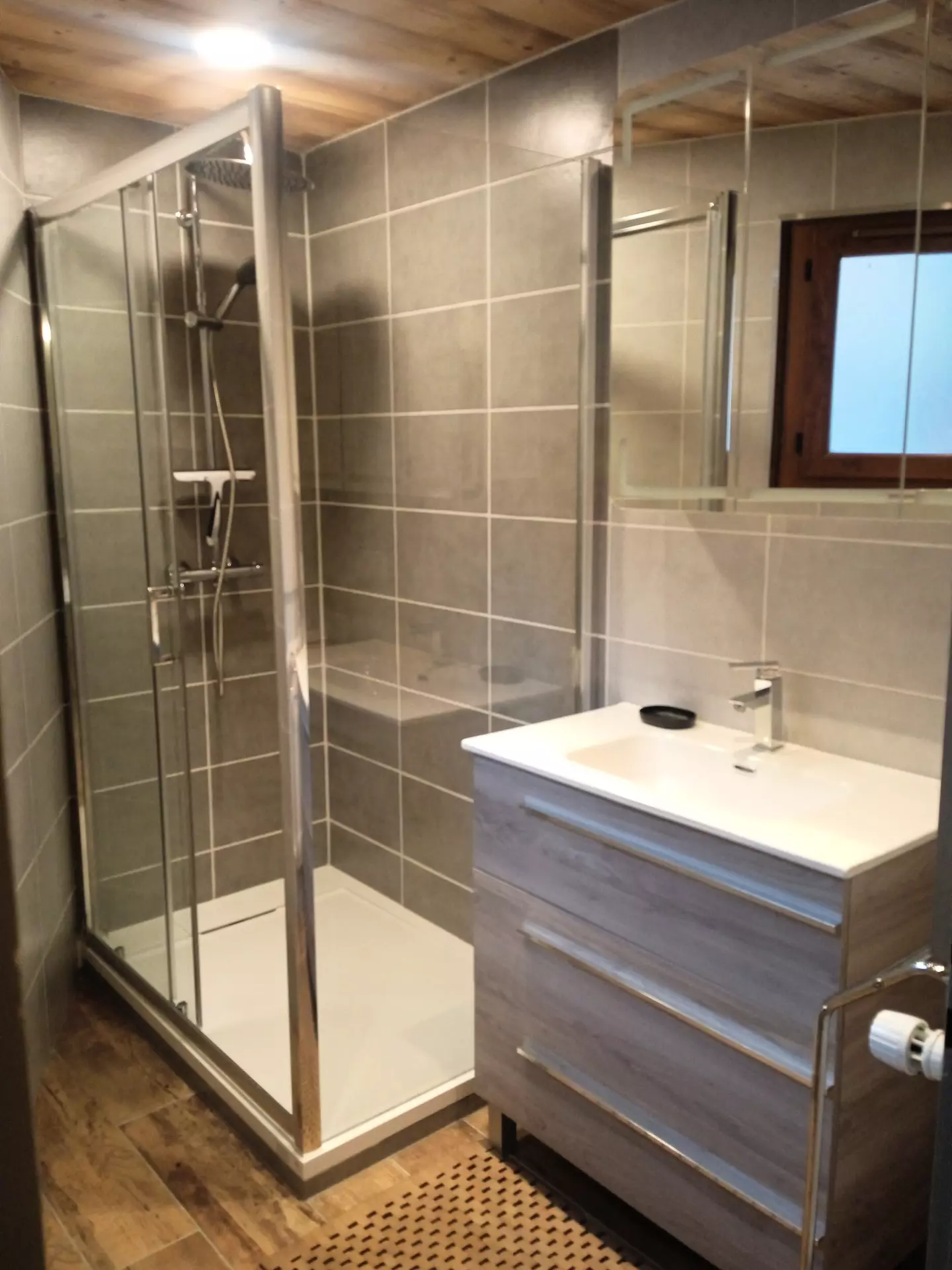 Bathroom: sink and walk-in shower.