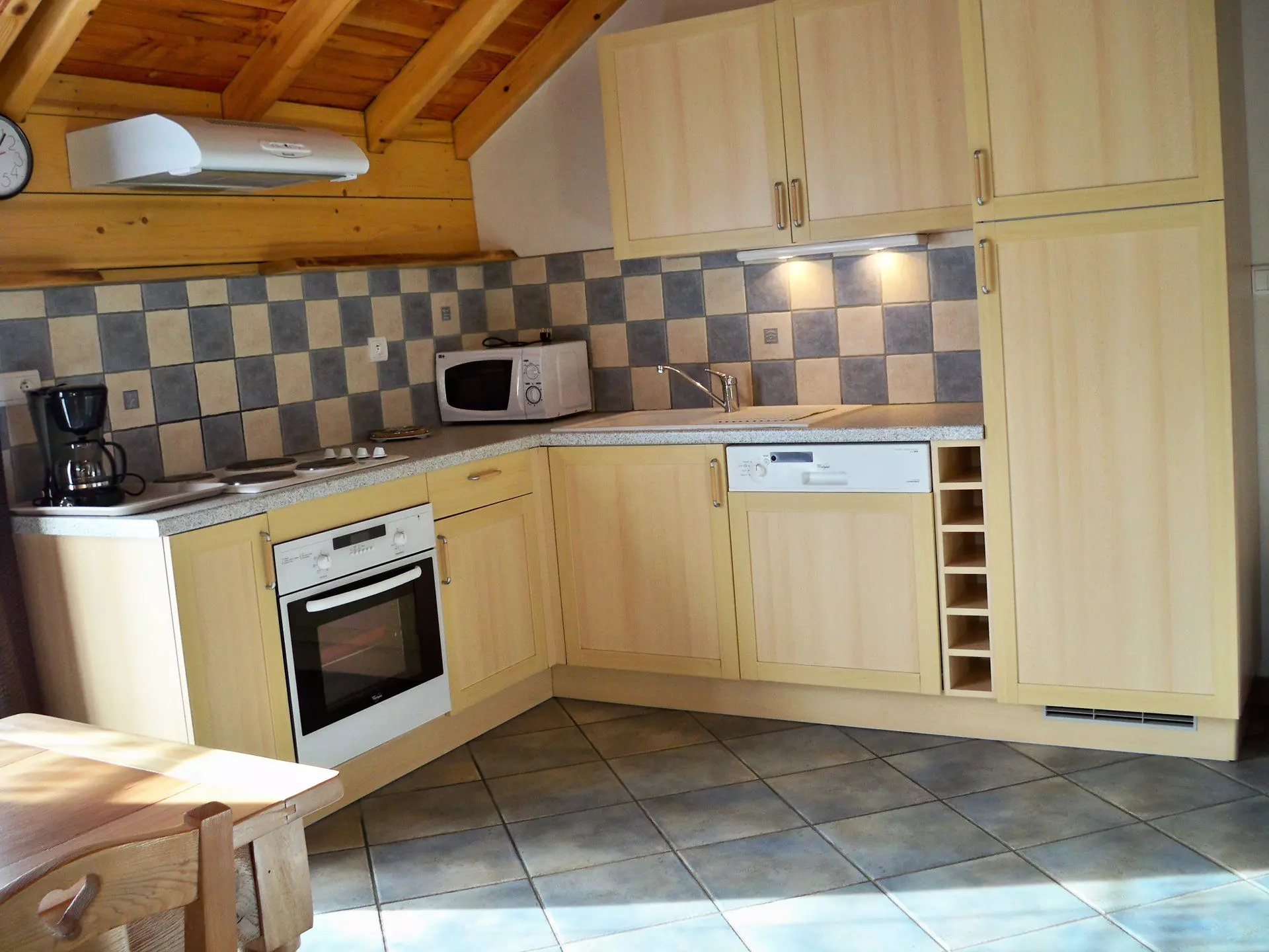 Kitchen area: oven, microwave, refrigerator + freezer (220L + 15L), 4 electric hotplates and dishwasher.