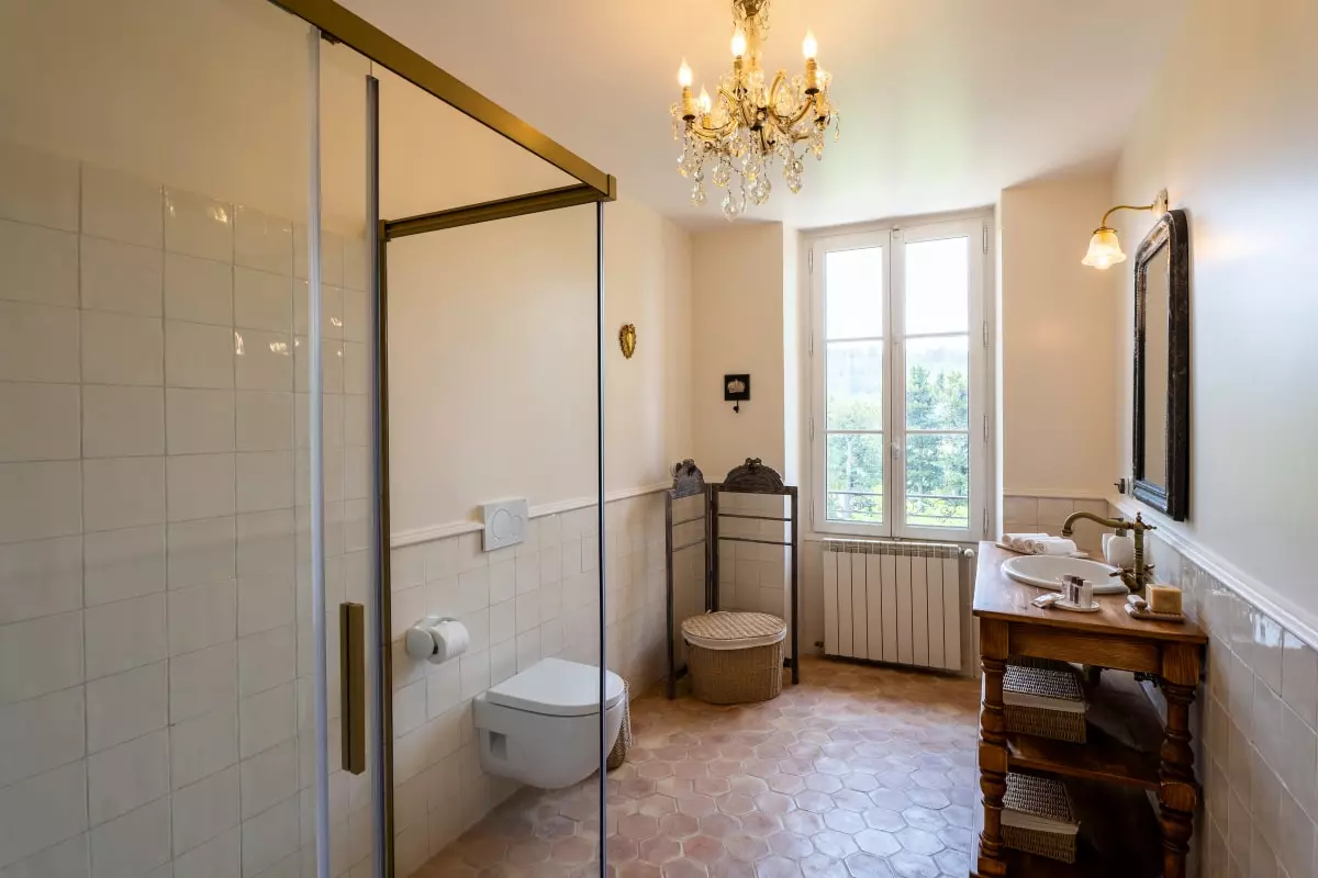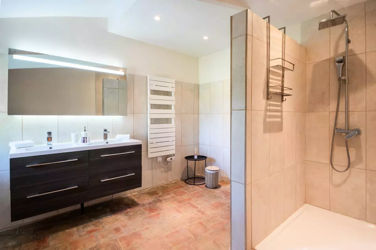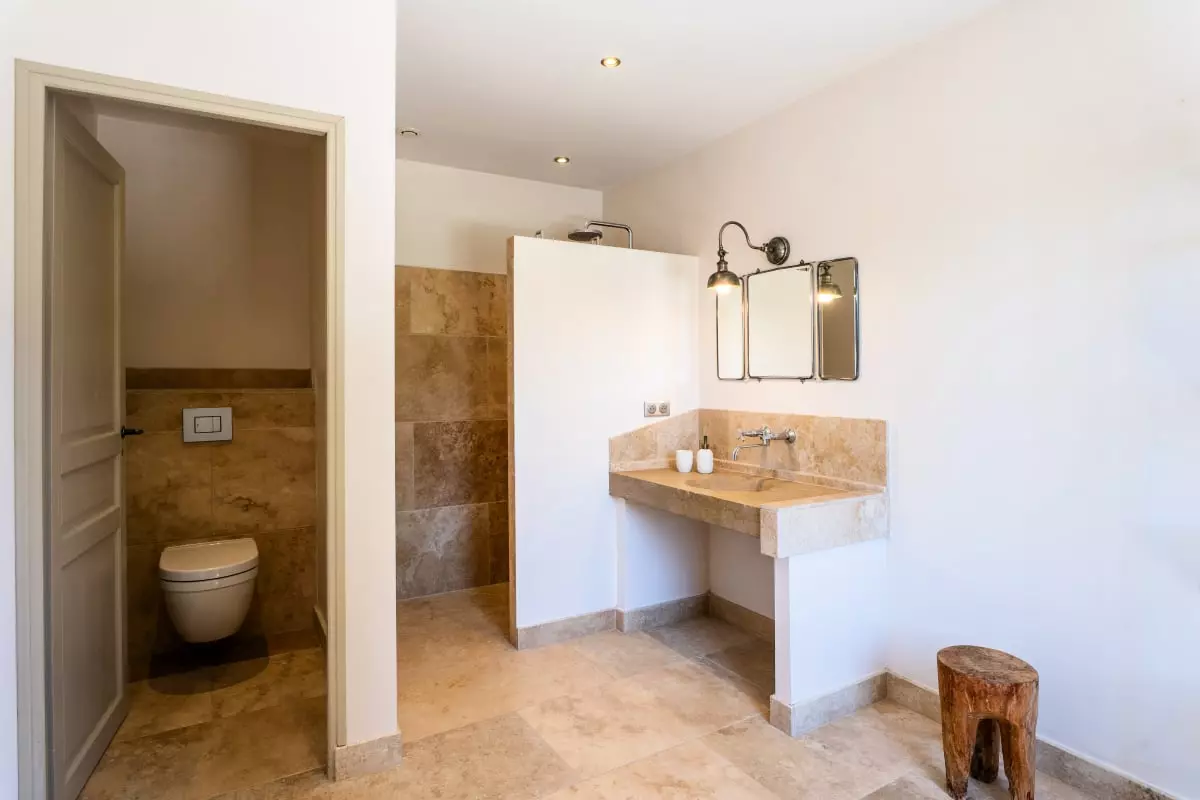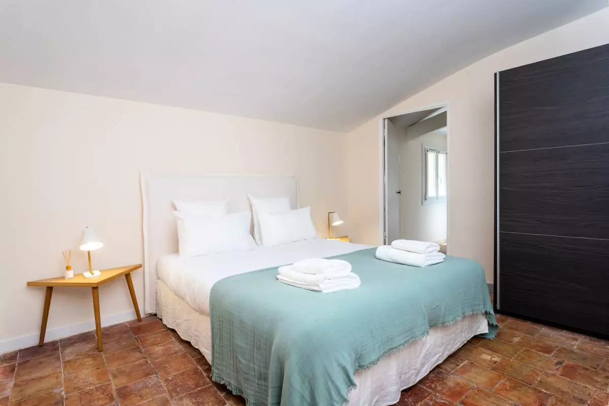 A stone staircase, with steps covered in antique terracotta tiles, leads to the upper floor. There, four elegant bedrooms await guests. The is a refined master suite with generous volumes, whose en-suite bathroom in natural stone offers a bathtub facing the garden, as well as a large walk-in shower. The selected materials, the soft lighting, and the mineral palette make it a true cocoon of rest. Two other bedrooms share a bathroom with a bathtub, perfect for siblings or children. The fourth bedroom, located slightly apart, benefits from its own bathroom, offering its occupants valuable independence.