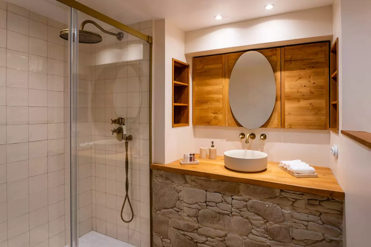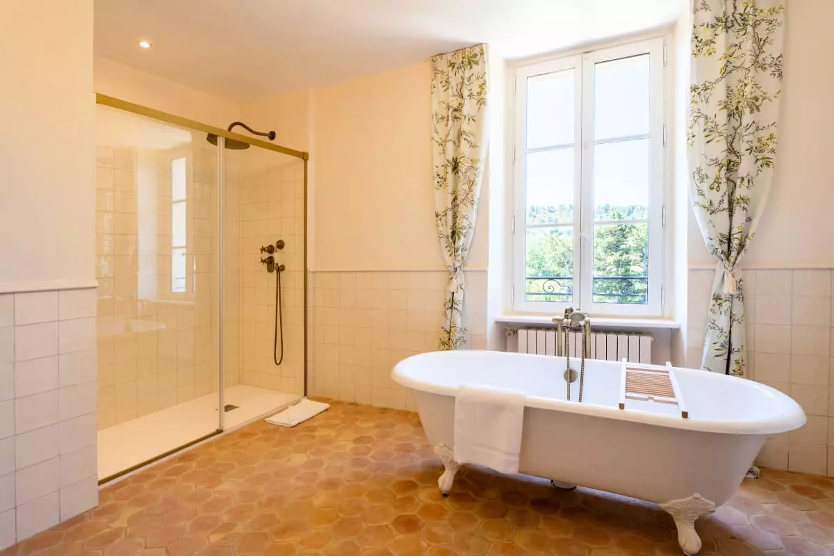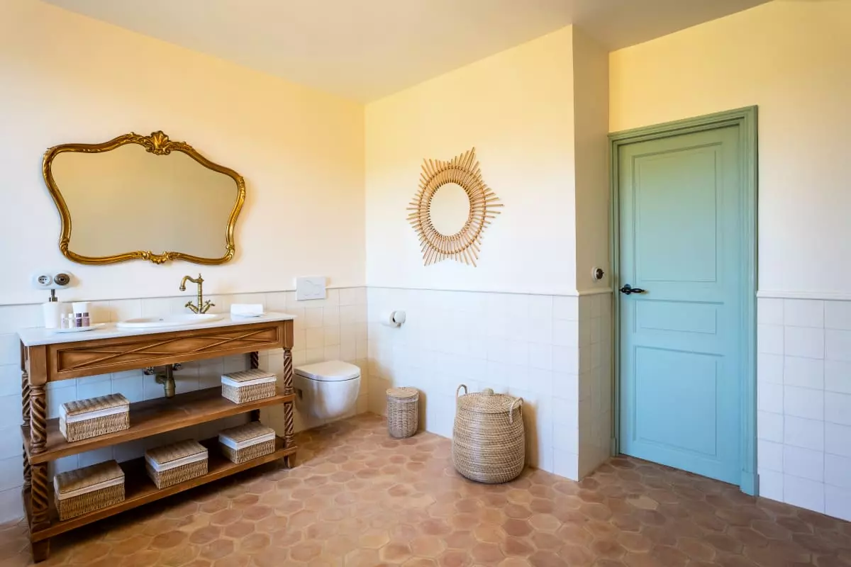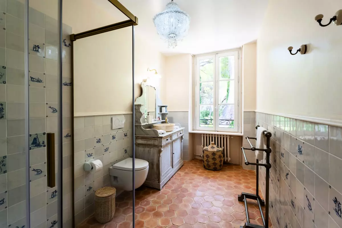 A stone staircase, with steps covered in antique terracotta tiles, leads to the upper floor. There, four elegant bedrooms await guests. The is a refined master suite with generous volumes, whose en-suite bathroom in natural stone offers a bathtub facing the garden, as well as a large walk-in shower. The selected materials, the soft lighting, and the mineral palette make it a true cocoon of rest. Two other bedrooms share a bathroom with a bathtub, perfect for siblings or children. The fourth bedroom, located slightly apart, benefits from its own bathroom, offering its occupants valuable independence.