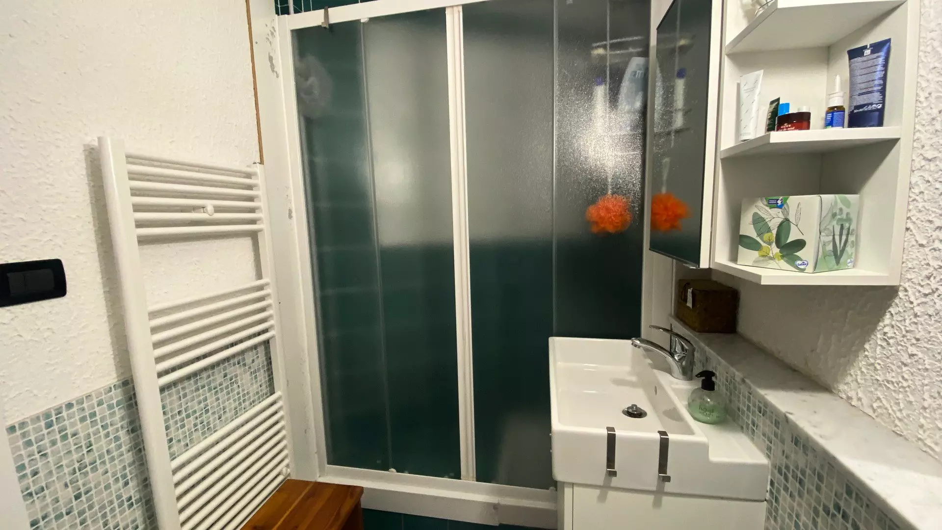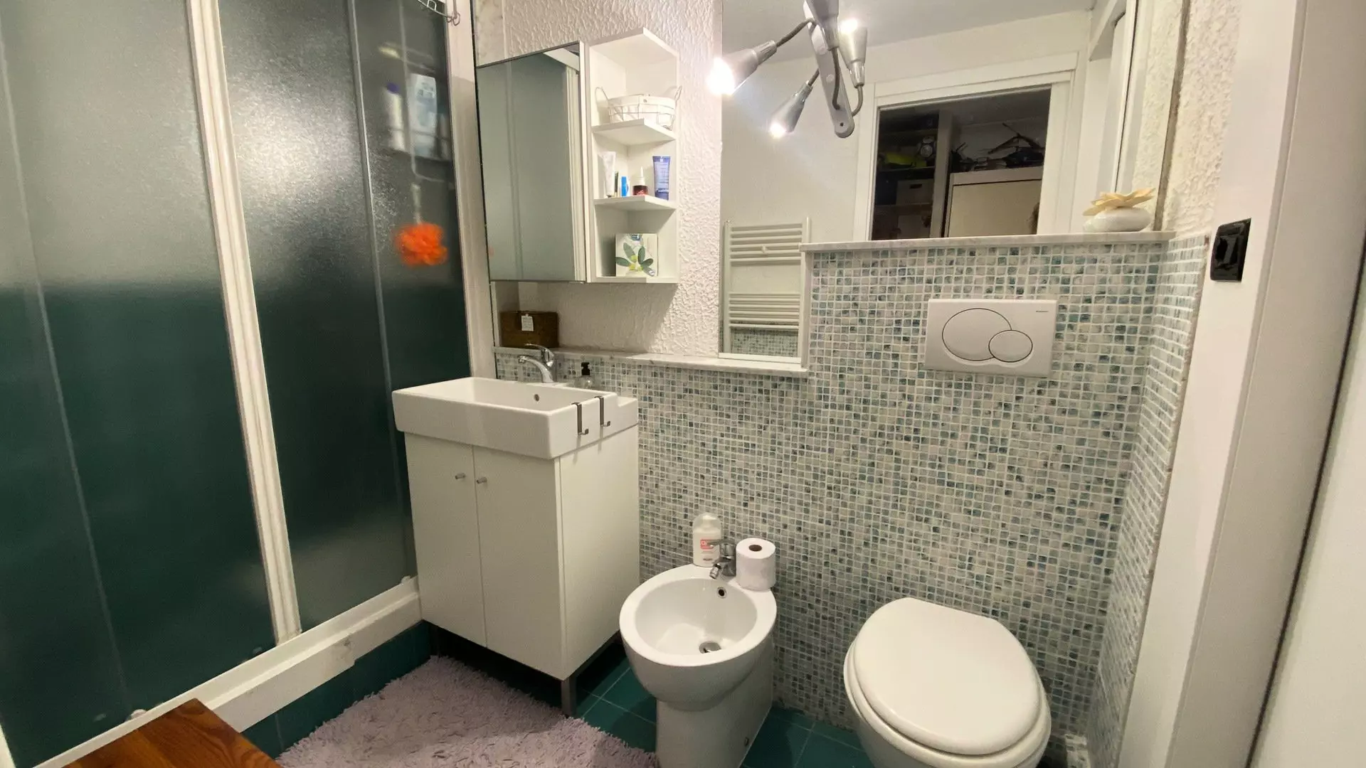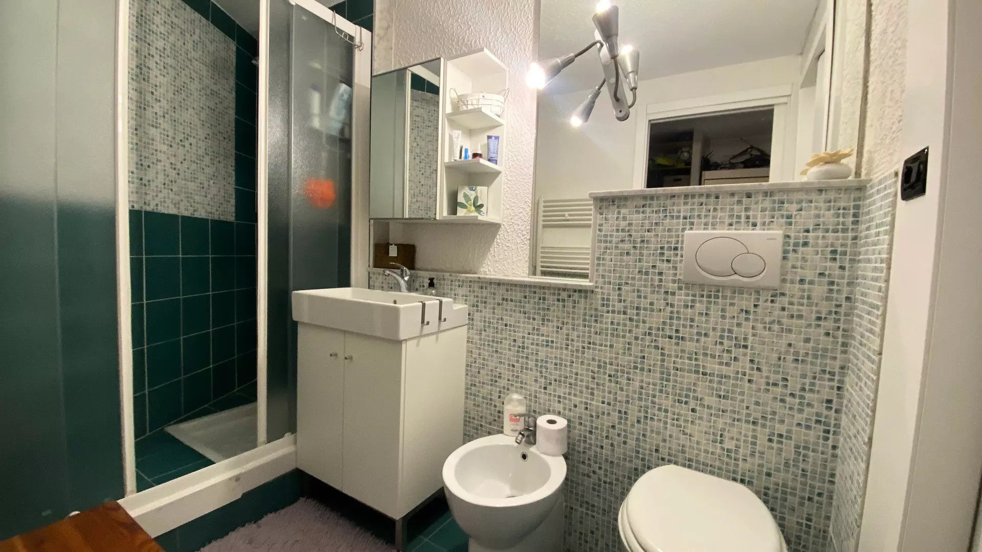 Fully renovated shower room: Large shower cubicle, vanity unit with sink, large mirror, wall-mounted electric towel dryer, storage cupboard, bidet, toilet.