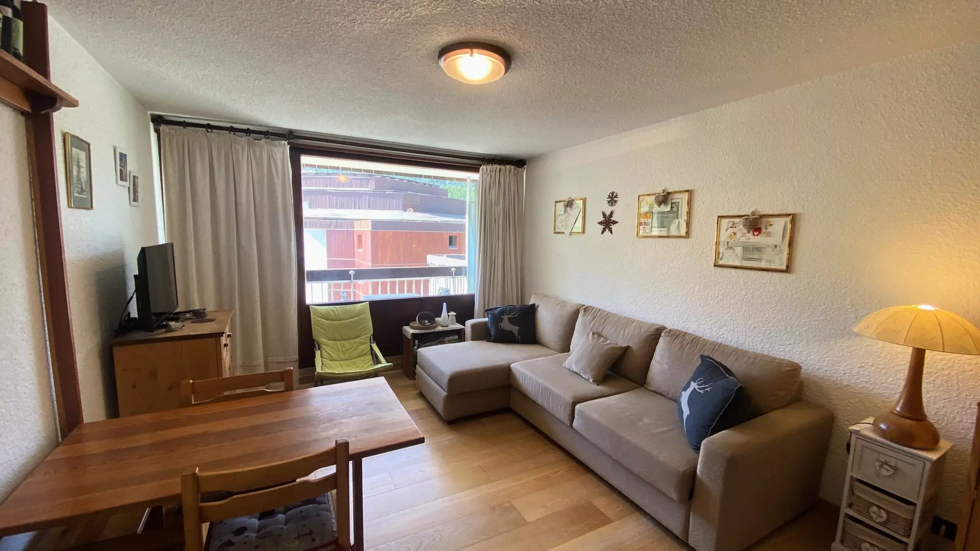 Living room: Television, chest of drawers, sofa with chaise longue, storage cupboard, access to the balcony, dining area with table and chairs.