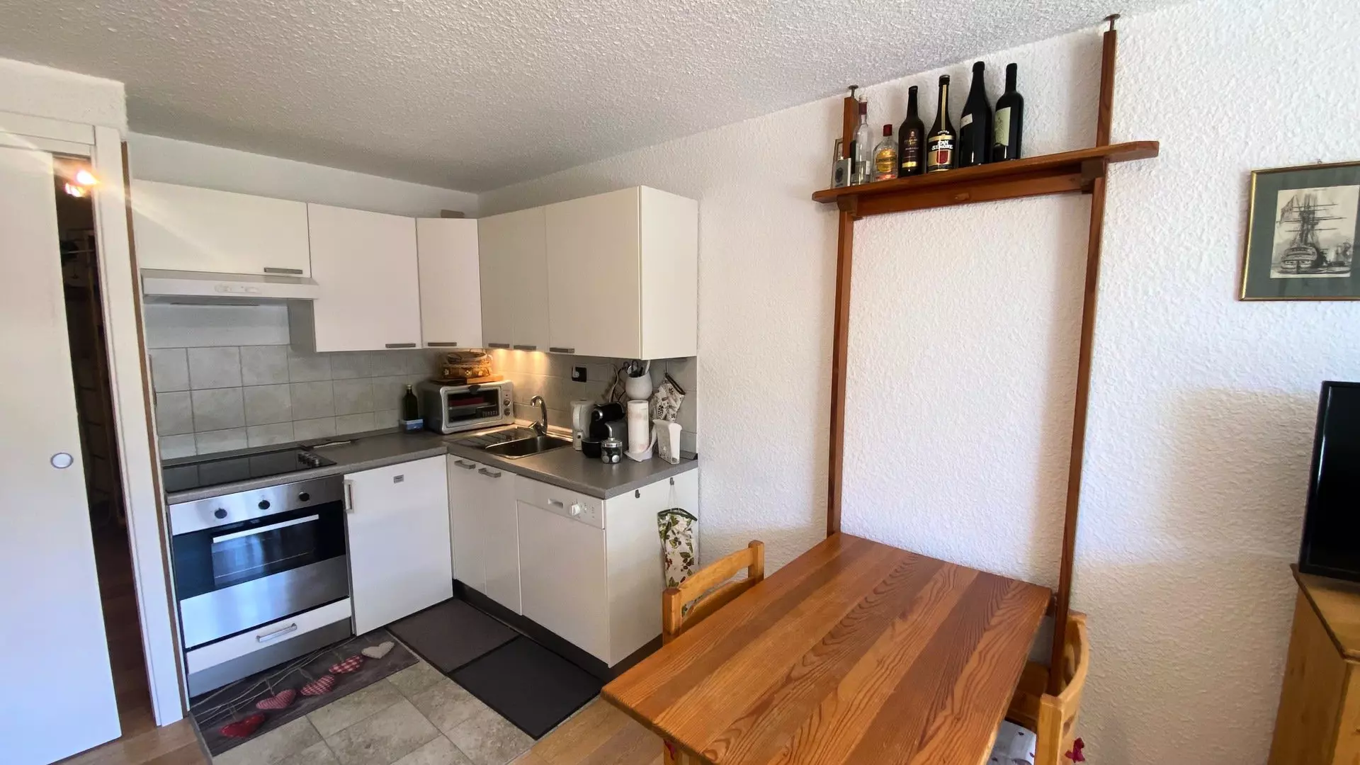 Kitchen area: 4-burner ceramic hob, top-mounted refrigerator, small grill oven, traditional oven, dishwasher, Nespresso coffee machine, toaster, kettle, numerous kitchen accessories and utensils, fondue set, stone grill set.