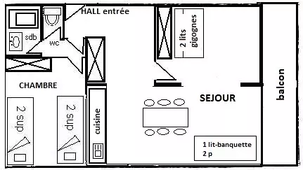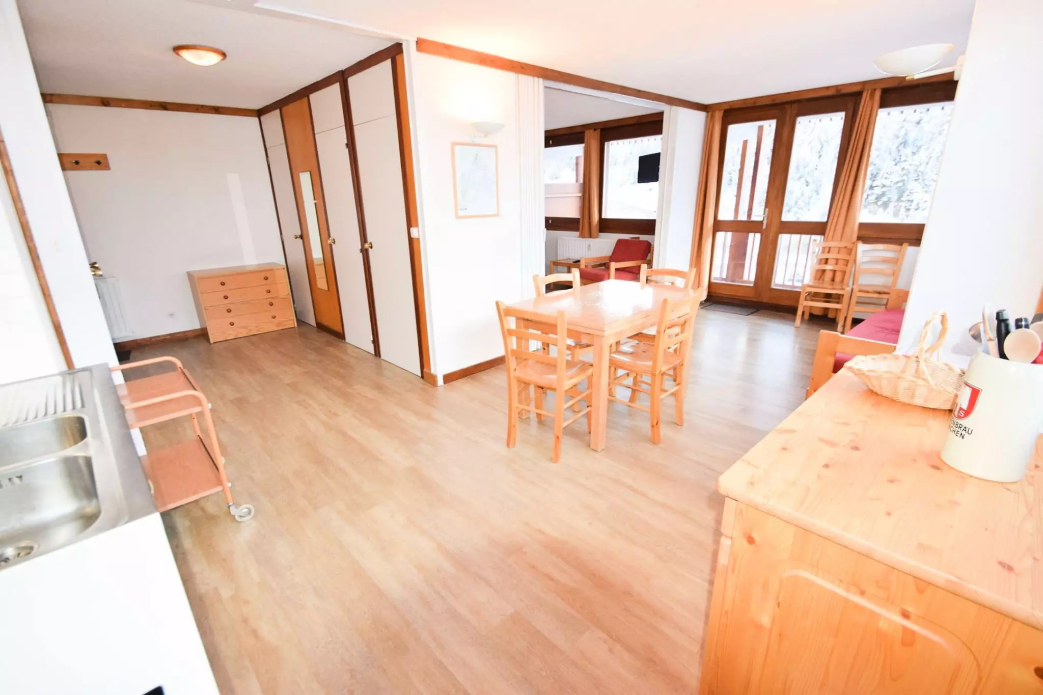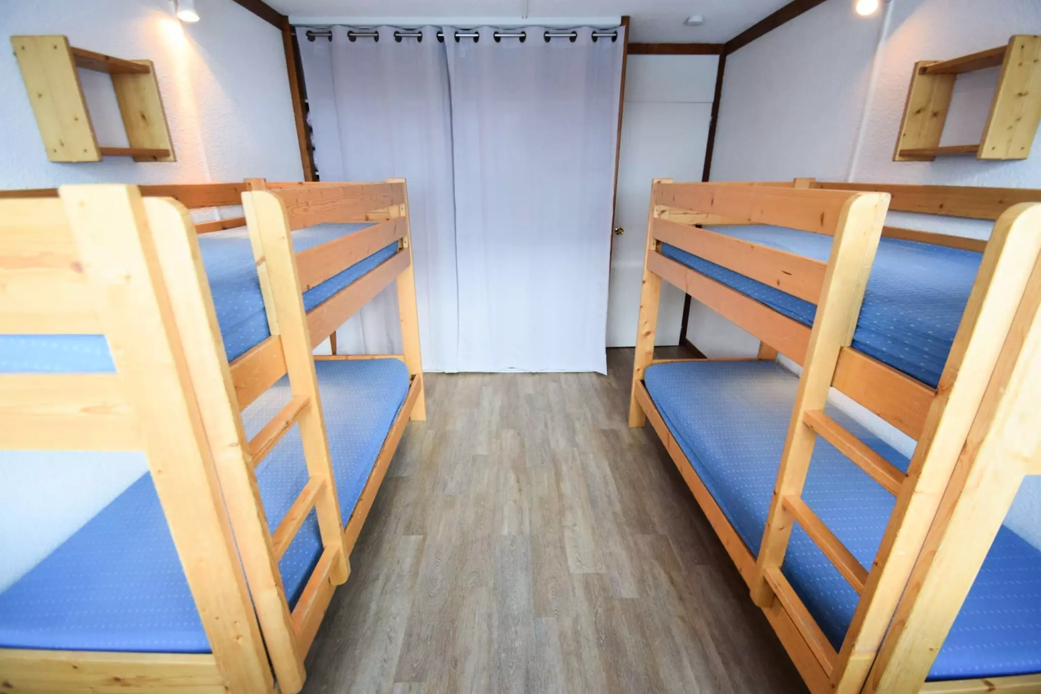 Apartment 7/8 people, Divisible living room + 1 bedroom, 61m2, South facing, view on slopes, with balcony, on the 6th floor with elevator - Open kitchen: 3 ceramic hobs, microwave grill oven, 2 refrigerators, dishwasher - Living room: divided into two rooms by sliding wall: on one side dining area, : 1 sofa bed for 2 people, divisible part: living room: 2 pull-out beds, TV - Bedroom: West facing, 2 X 2 bunk beds for 1 person, bathroom: bathtub, separate WC - Bedding: blankets - Floors: plastic - WIFI - Non-smoking apartment, pets not allowed. Optional and extra: End of stay cleaning, sheets, towels, ski passes. Ski locker n°62 on the ground floor, direct access to the slopes.