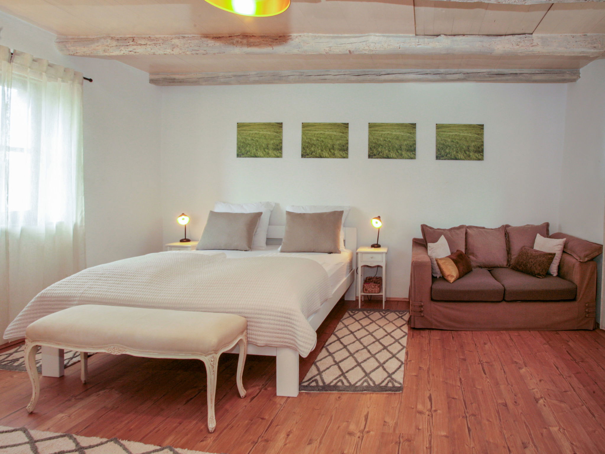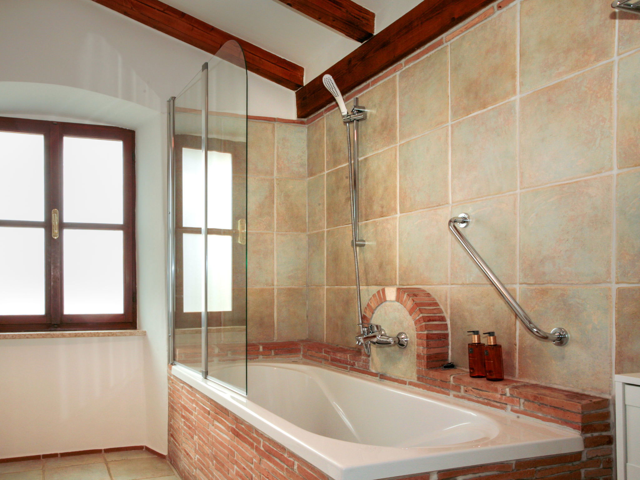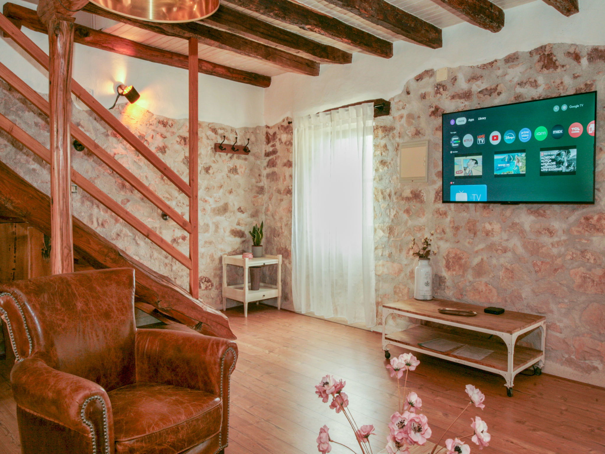 2-room apartment 99 m2 on 2 levels on 1st floor. Very stylish furnishings: living room with 1 double sofabed (160 cm, length 190 cm), satellite TV (flat screen), air conditioning. Exit to the balcony. Kitchen (oven, dishwasher, 4 ceramic glass hob hotplates, toaster, kettle, microwave, freezer, electric coffee machine) with dining table. Bath/bidet/WC. Upper floor: 1 large room with 1 french bed (180 cm, length 200 cm), satellite TV (flat screen), air conditioning. Exit to the terrace. Forced-air heating. Balcony 6 m2, terrace 10 m2. Terrace furniture, balcony furniture. Partial view of the countryside. Facilities: washing machine, baby cot, hair dryer. Internet (WiFi, free). Maximum 1 small pet/ dog allowed.