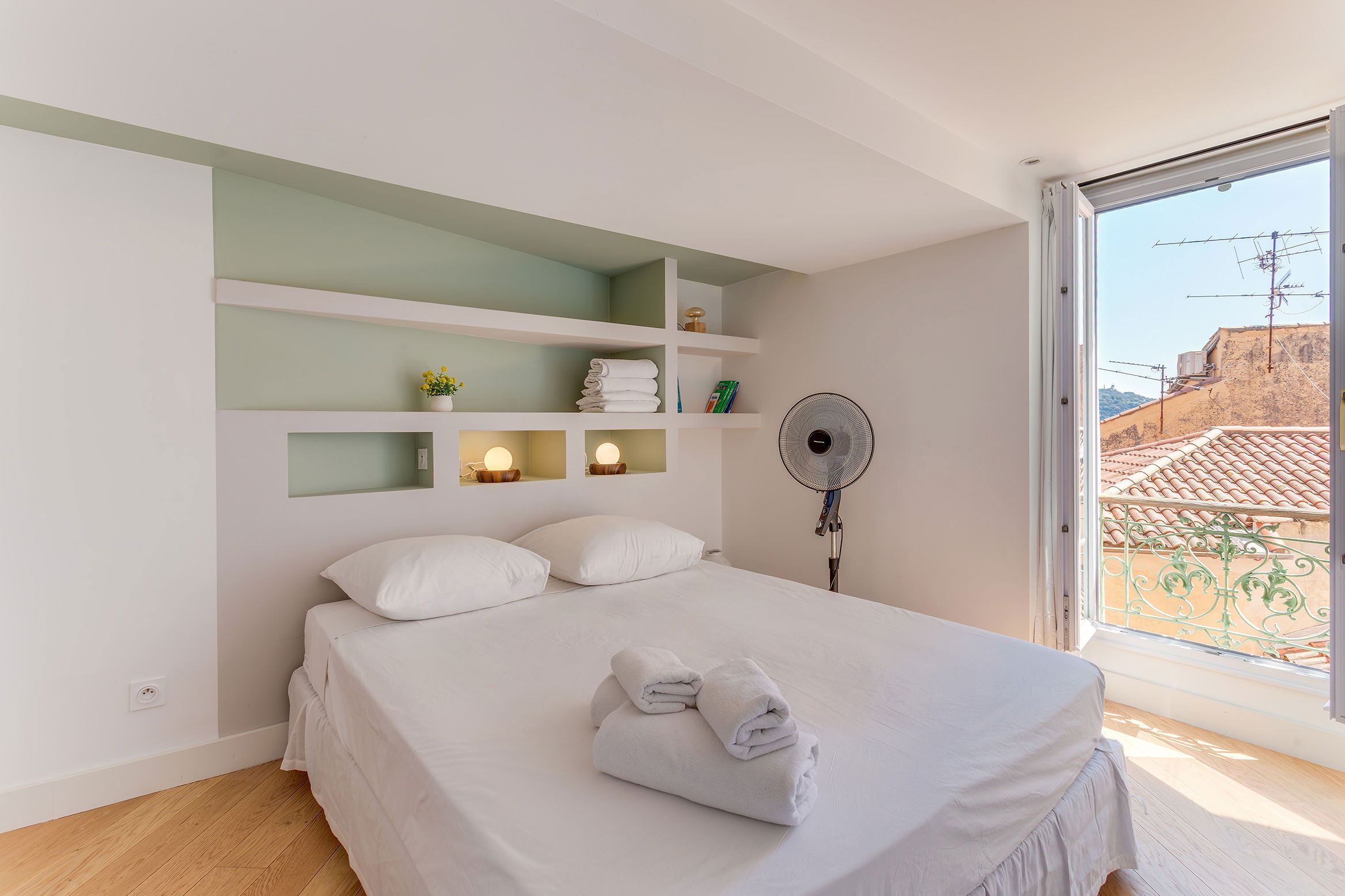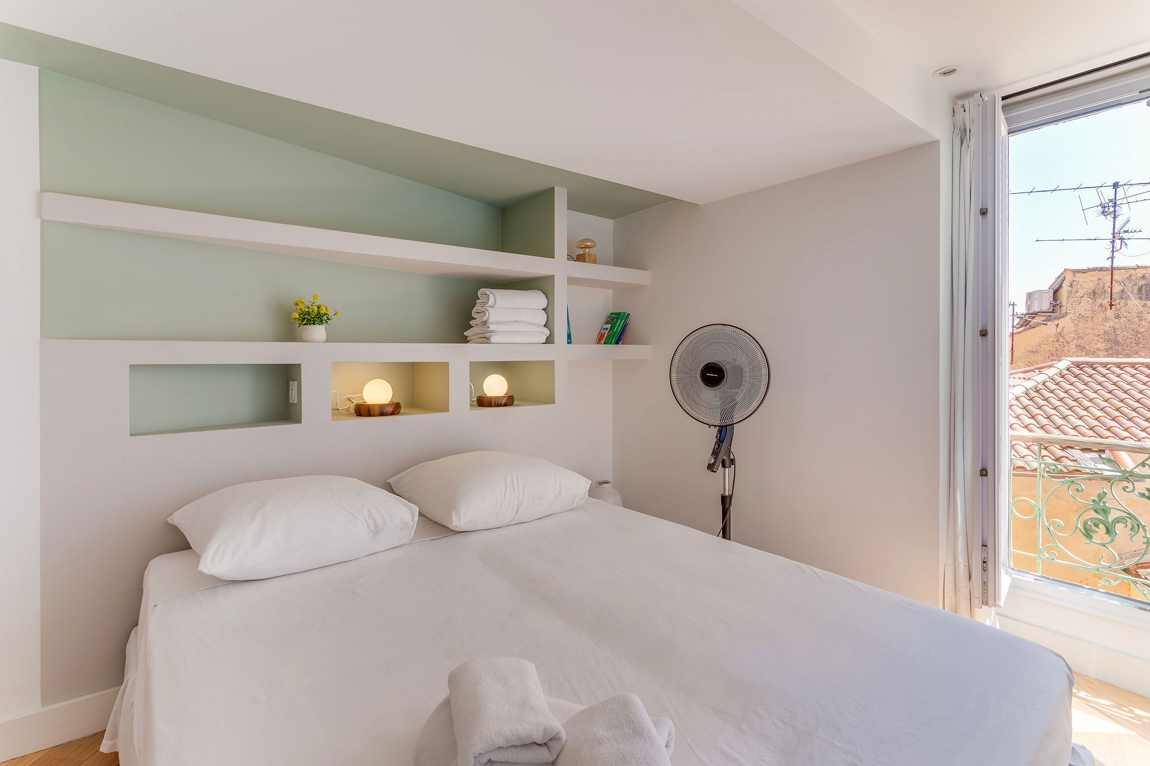 A comfortable room with a large double bed that can be separated into 2 single beds (upon request before arrival) and windows overlooking the roofs of the old town