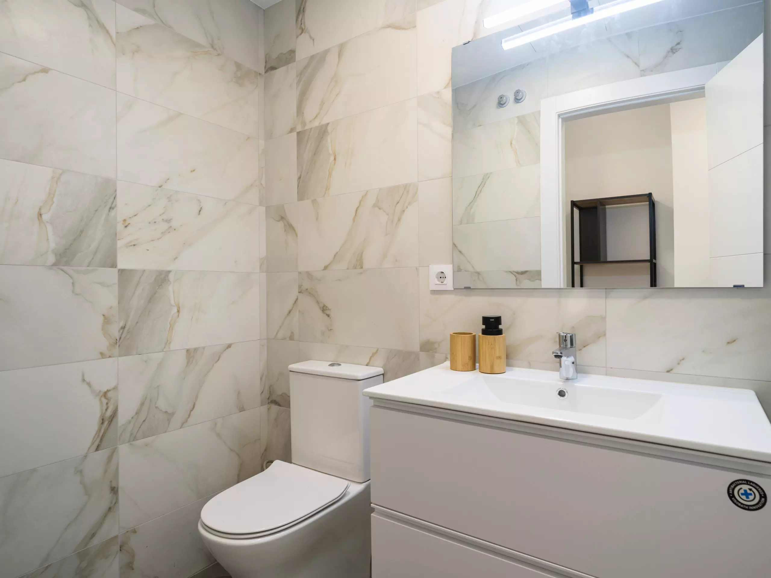 The en-suite bathroom is fully equipped with a shower and features efficiency features such as a water-efficient toilet and an ergonomic showerhead. Details like LED lighting and marble floors add a touch of elegance to the space.