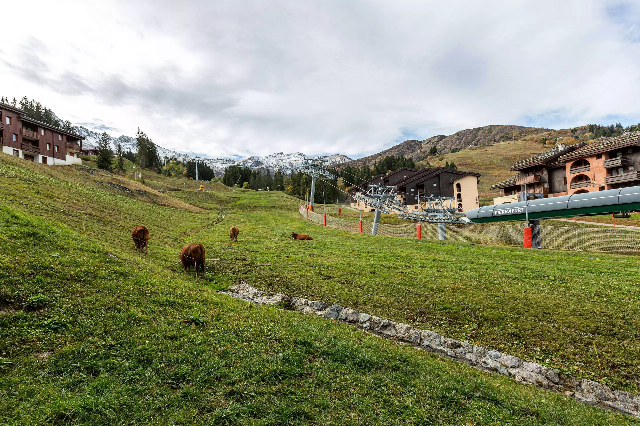 The "Le Pierrafort" residence offers ski-in/ski-out access and easy access to the shops in the Crève Coeur district. The Télébourg ski lift is less than 100 meters away. Many of the apartments offer views of the slopes. Paid parking is available at the foot of the residences.