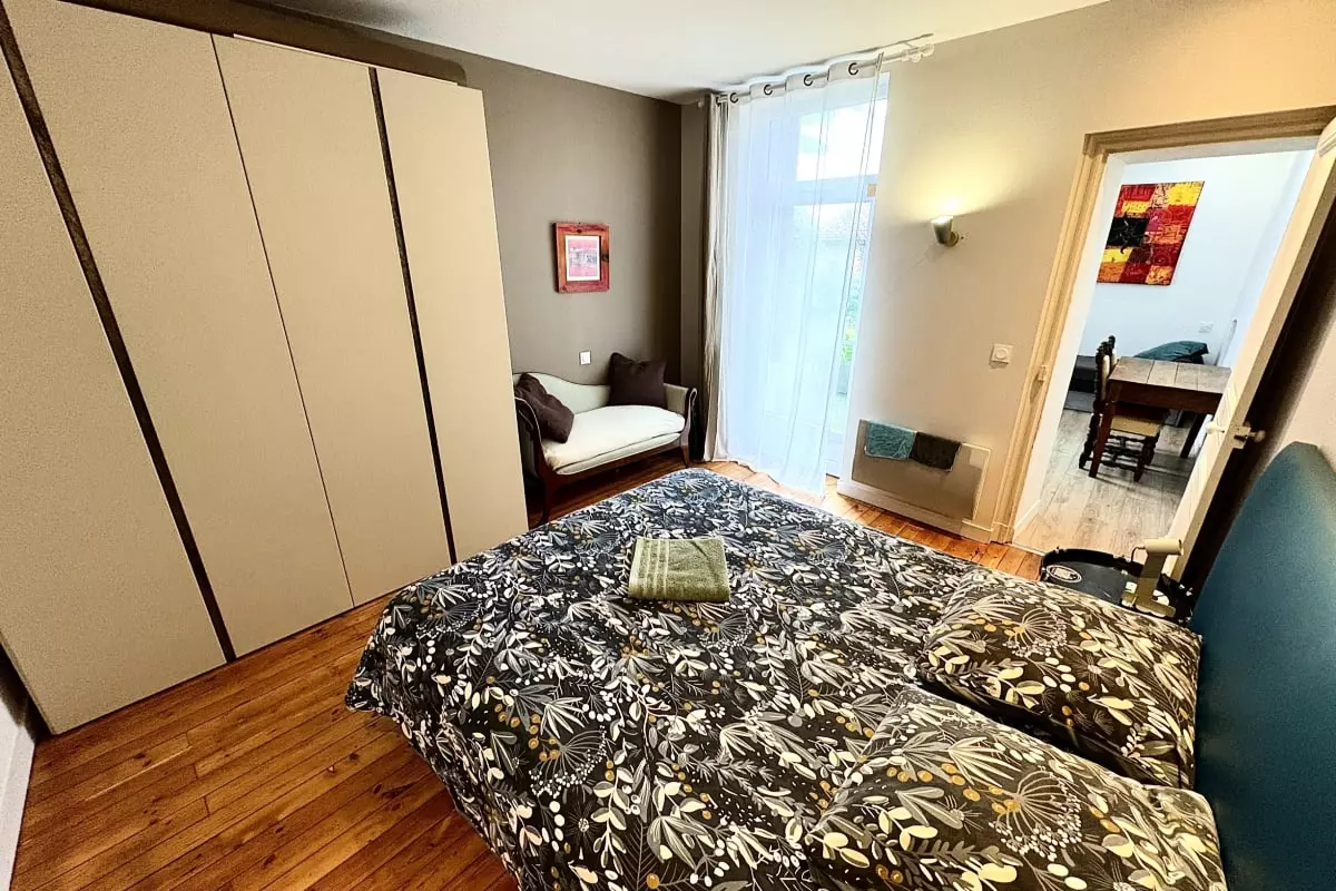 You will find a cozy bedroom with a double bed of 160 x 190, as well as a second bedroom of 9 m² with a pull-out bed comprising two beds of 80 x 180, accessible only from the .