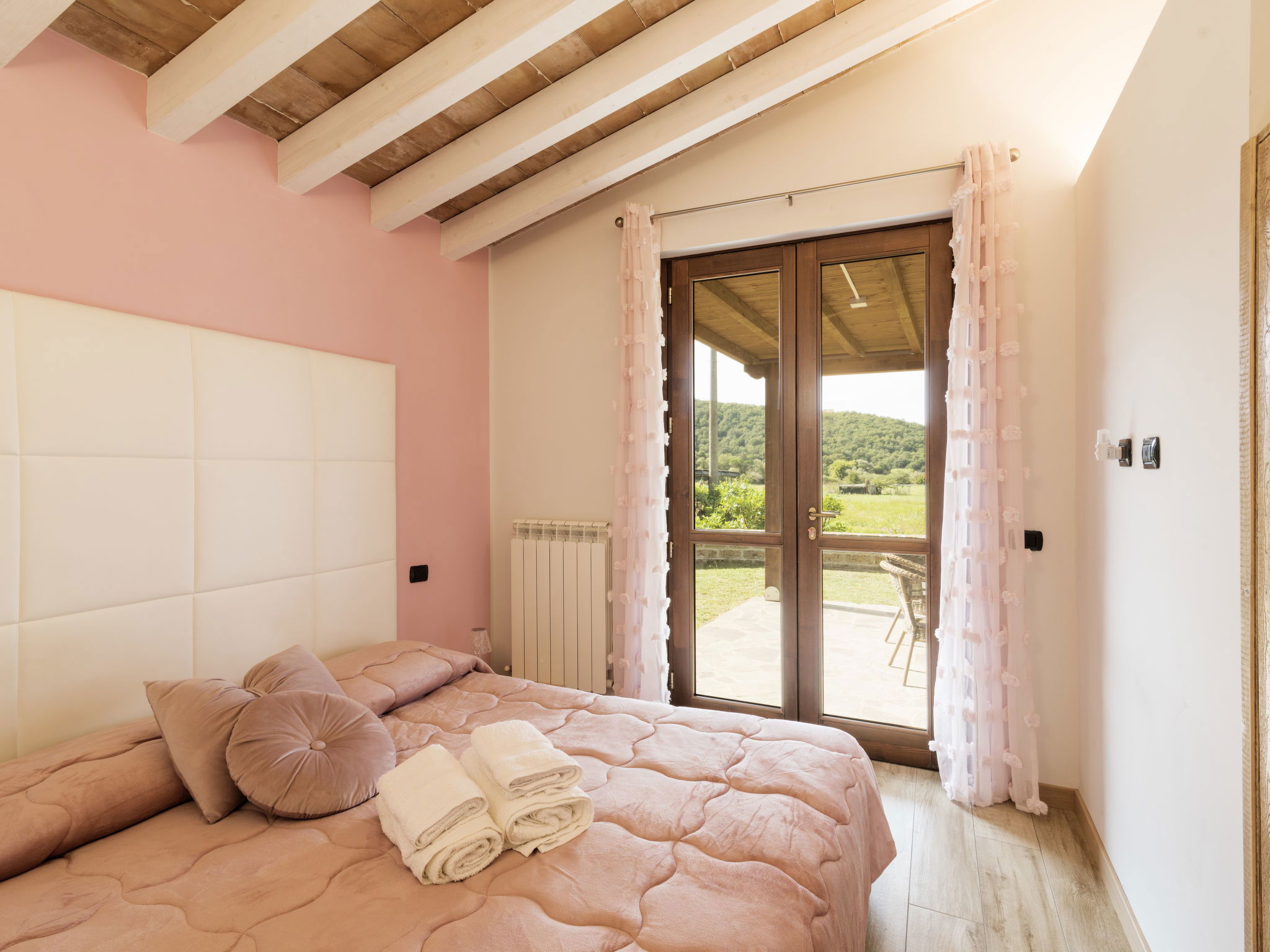 Beautiful, cosy country house "Podere La Cavallara", surrounded by fields. 6 apartments in the residence. 4 km from the centre of Montefiascone, 17 km from the centre of Viterbo, 85 km from the centre of Roma, 1.1 km from the lake. For shared use: property 2'500 m2, well-kept garden with lawn and trees, swimming pool (12 x 6 m, depth 140 - 150 cm, seasonal availability: 16.May. - 03.Oct.) with salt-electrolysis pool-cleaning system. Outdoor shower, garden furniture, barbecue, children's playground. In the complex: WiFi, hot tub (extra). Washing machine (for shared use), bicycles available. Motor access (200 m via unmade road). Roofed, parking on the premises. Shop 1.5 km, supermarket 4 km, bus stop 2.8 km, railway station "Montefiascone" 7 km, sandy beach "Lago di Bolsena" 1.1 km, grass beach "Lago Di Bolsena" 1.1 km, thermal baths "Terme Dei Papi" 16 km, bathing lake "Lago di Bolsena" 1.1 km. Nearby attractions: Bolsena 18 km, Civita Di Bagno Regio 18 km, Viterbo 19 km, Caprarola 35 km, Orvieto 30 km, Pitigliano 40 km. Please note: car recommended.