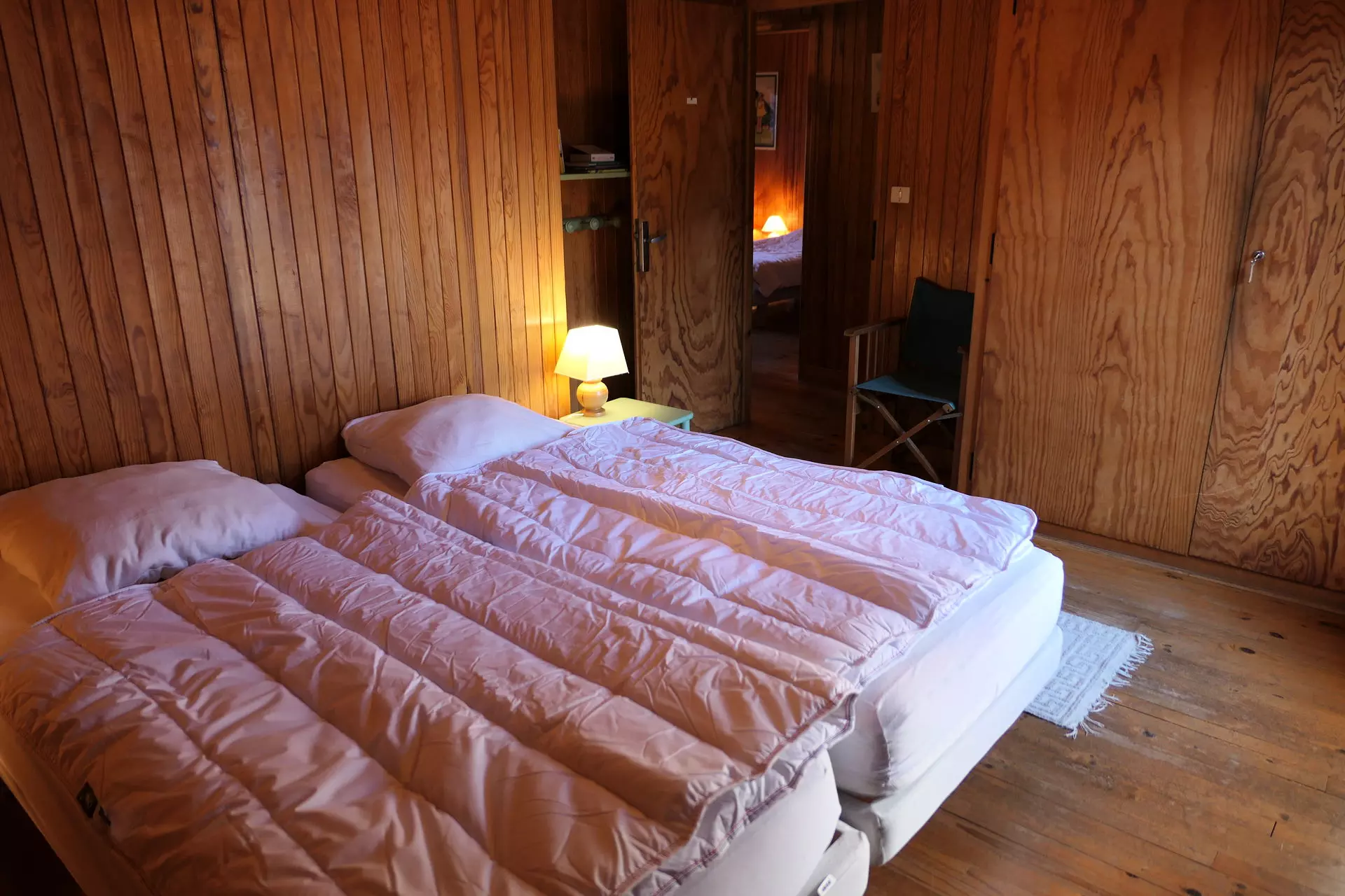 - A bedroom with 2 single beds and storage cupboard.