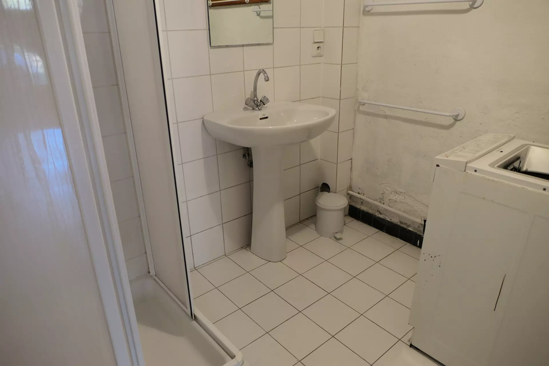 - Bathroom with shower and washing machine.