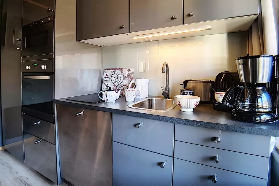 Kitchen equipped with 2 ceramic hobs, microwave, traditional oven, refrigerator, dishwasher, kettle, toaster and coffee maker.