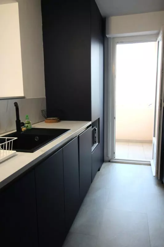 The kitchen is fully equipped and opens onto a second balcony.