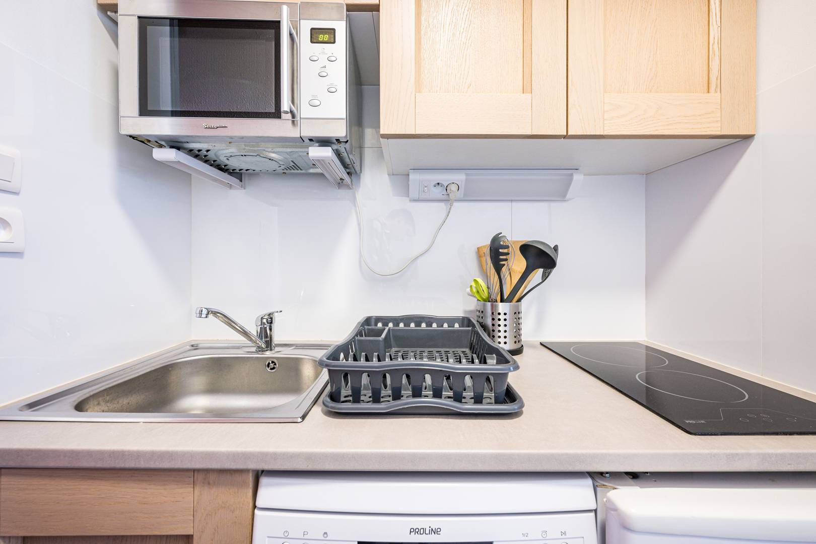 - The kitchen, located in the entrance to the apartment, is fully equipped with 2 electric hobs, a refrigerator, microwave, electric coffee maker, toaster, kettle, dishwasher, etc.