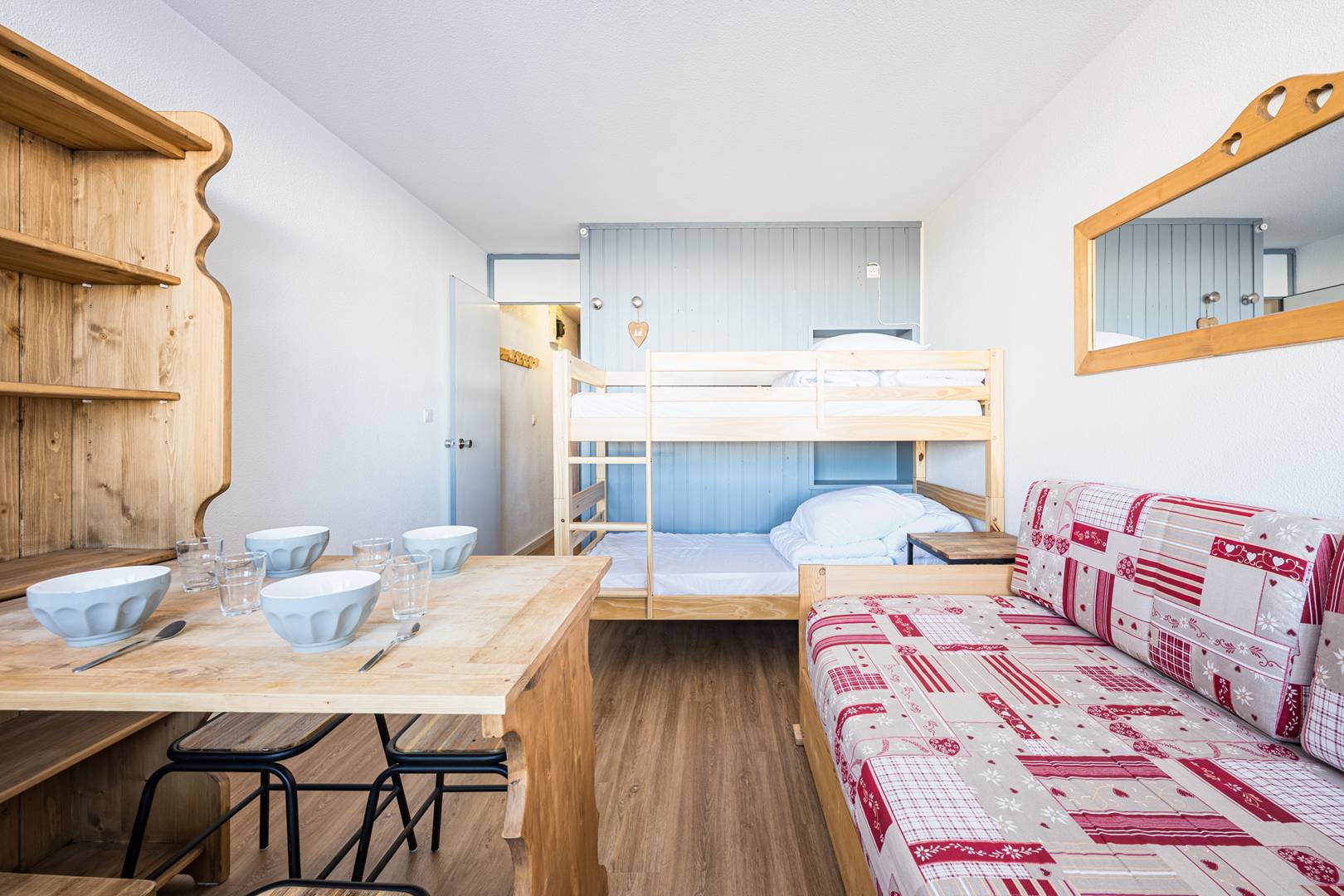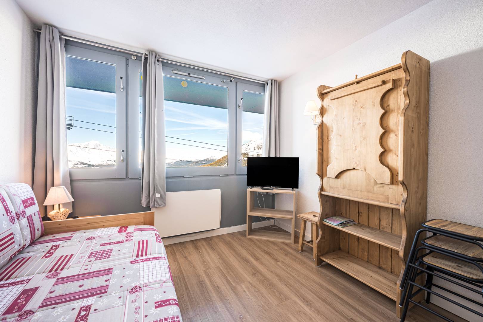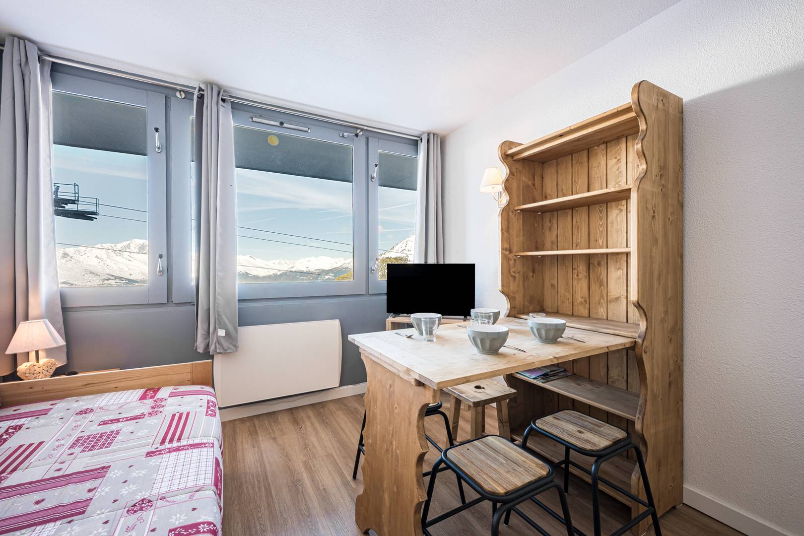 Charming, tastefully decorated studio with breathtaking views of Mont Blanc and the Tarentaise Valley. Ideally located in the heart of La Plagne Aime 2000, this ski-in/ski-out residence features direct access to the slopes and a convenient shopping gallery.