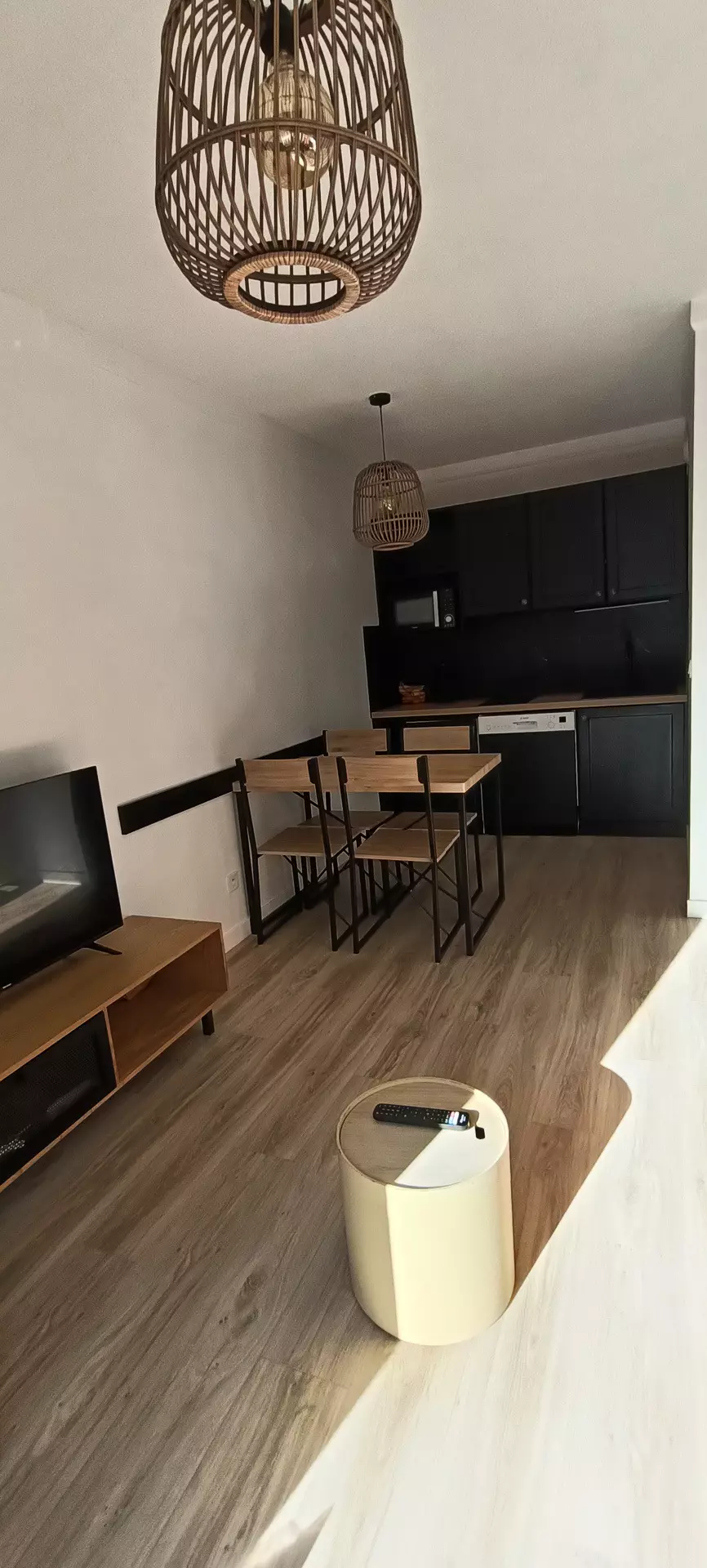 - Kitchen area with 2 induction hobs, refrigerator, dishwasher, oven-microwave combination.