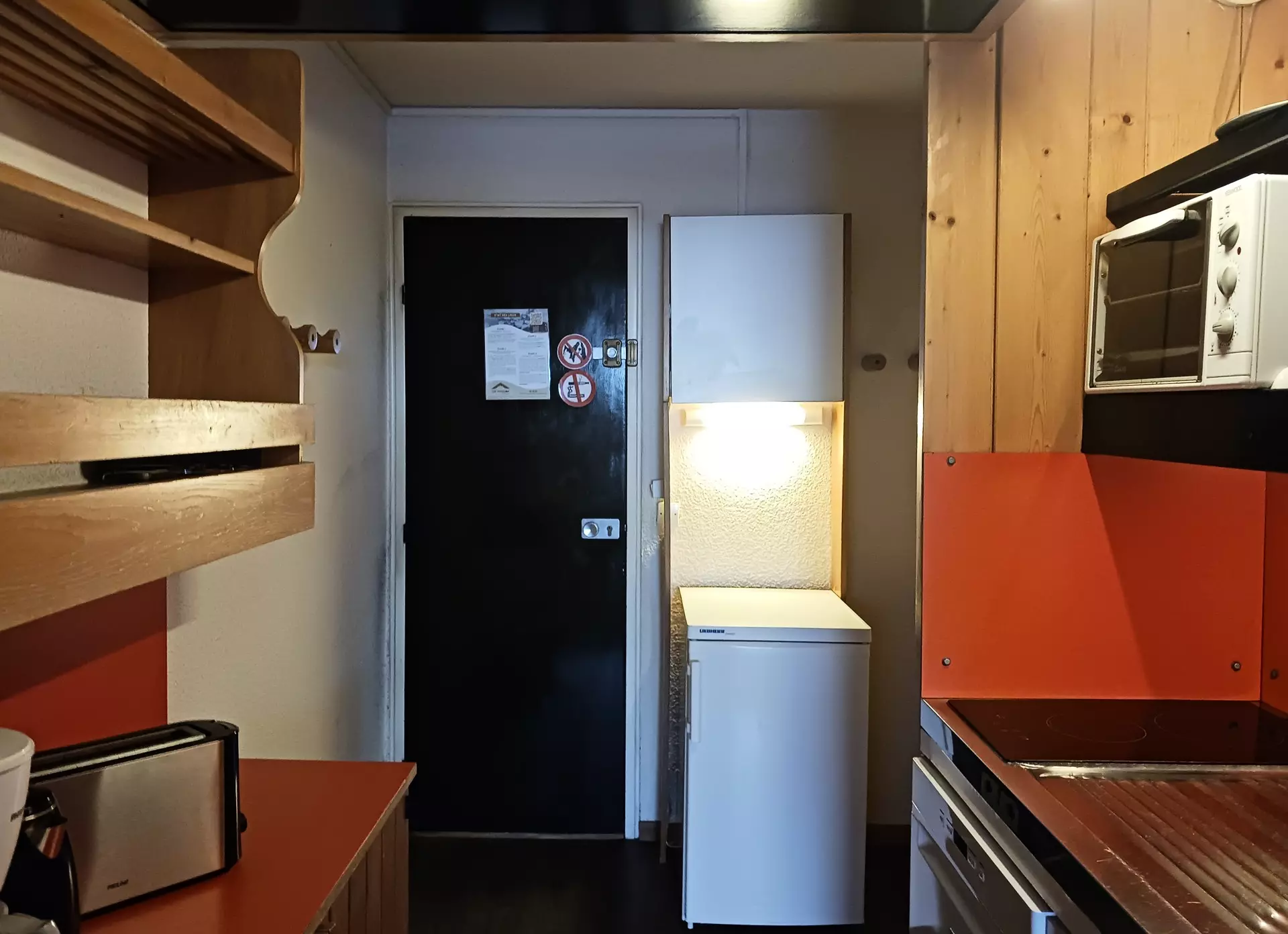 It is equipped with electric hobs, an oven, a microwave, a dishwasher and a refrigerator.