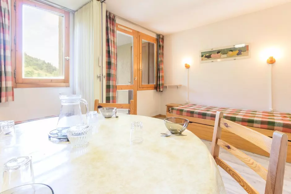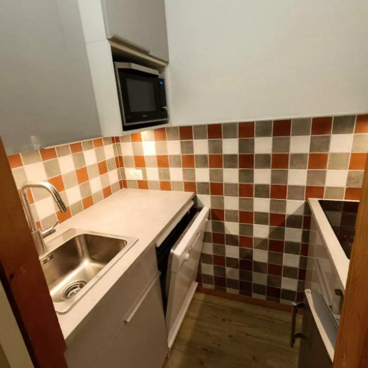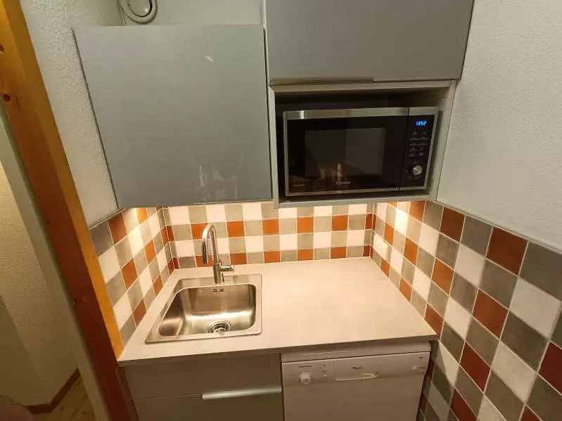 This studio with south-facing terrace overlooking the Montchavin slope consists of an equipped kitchenette (3-burner ceramic hob, toaster, electric coffee maker, dishwasher, combined microwave oven, refrigerator with small freezer), a bathroom with bathtub and separate toilet.