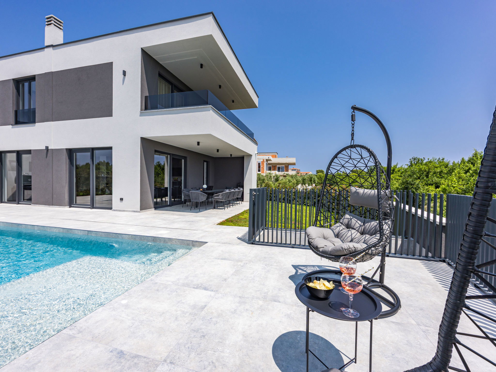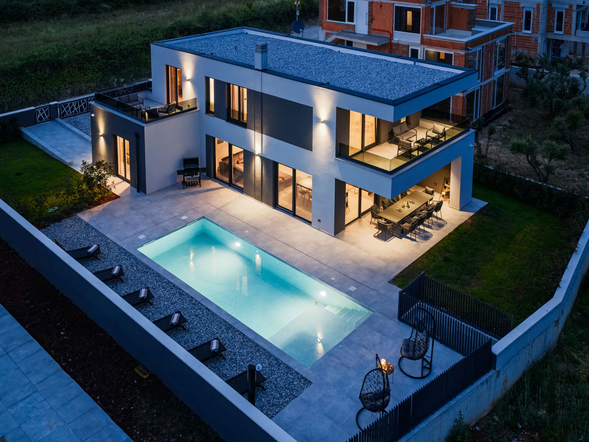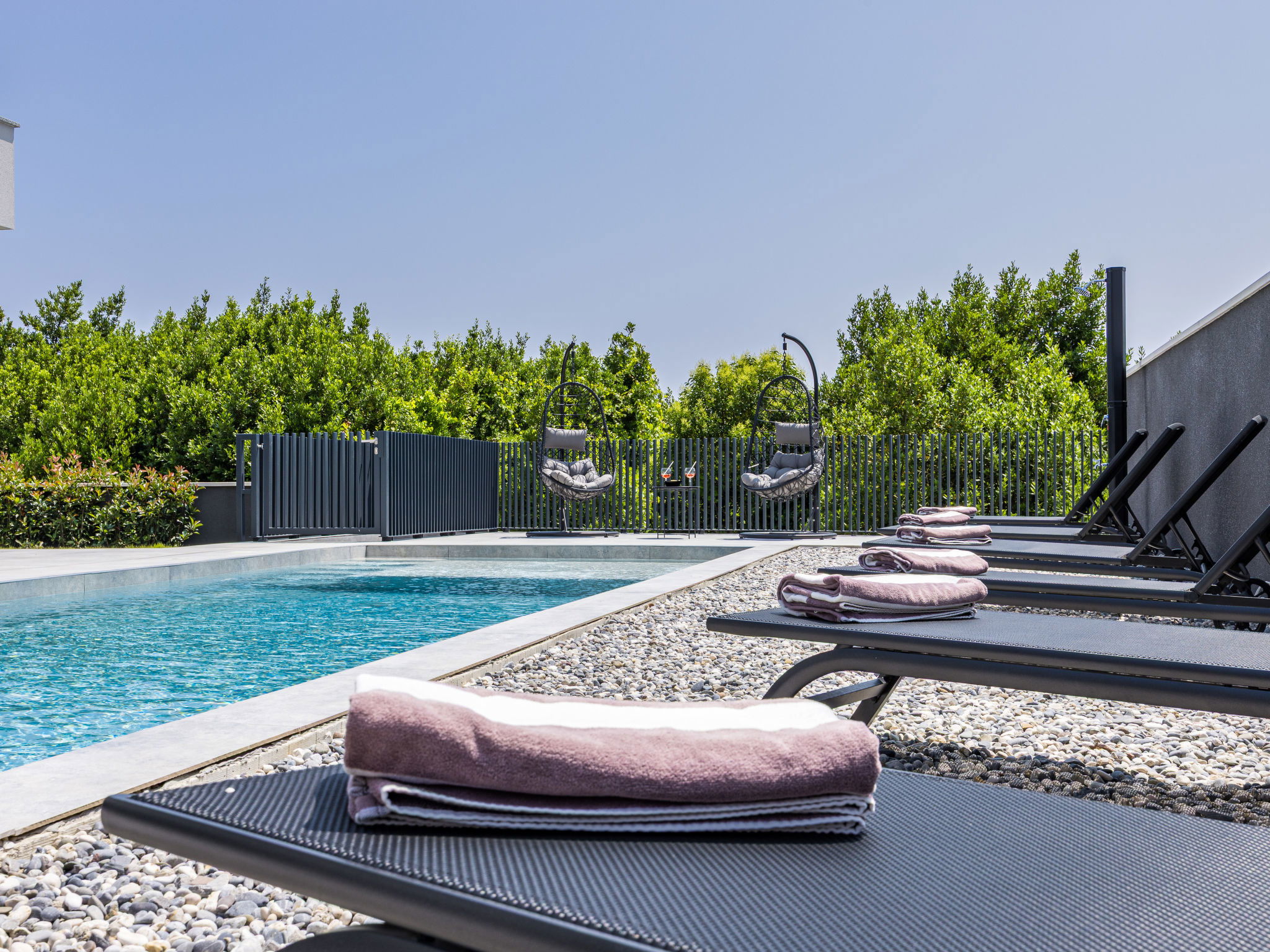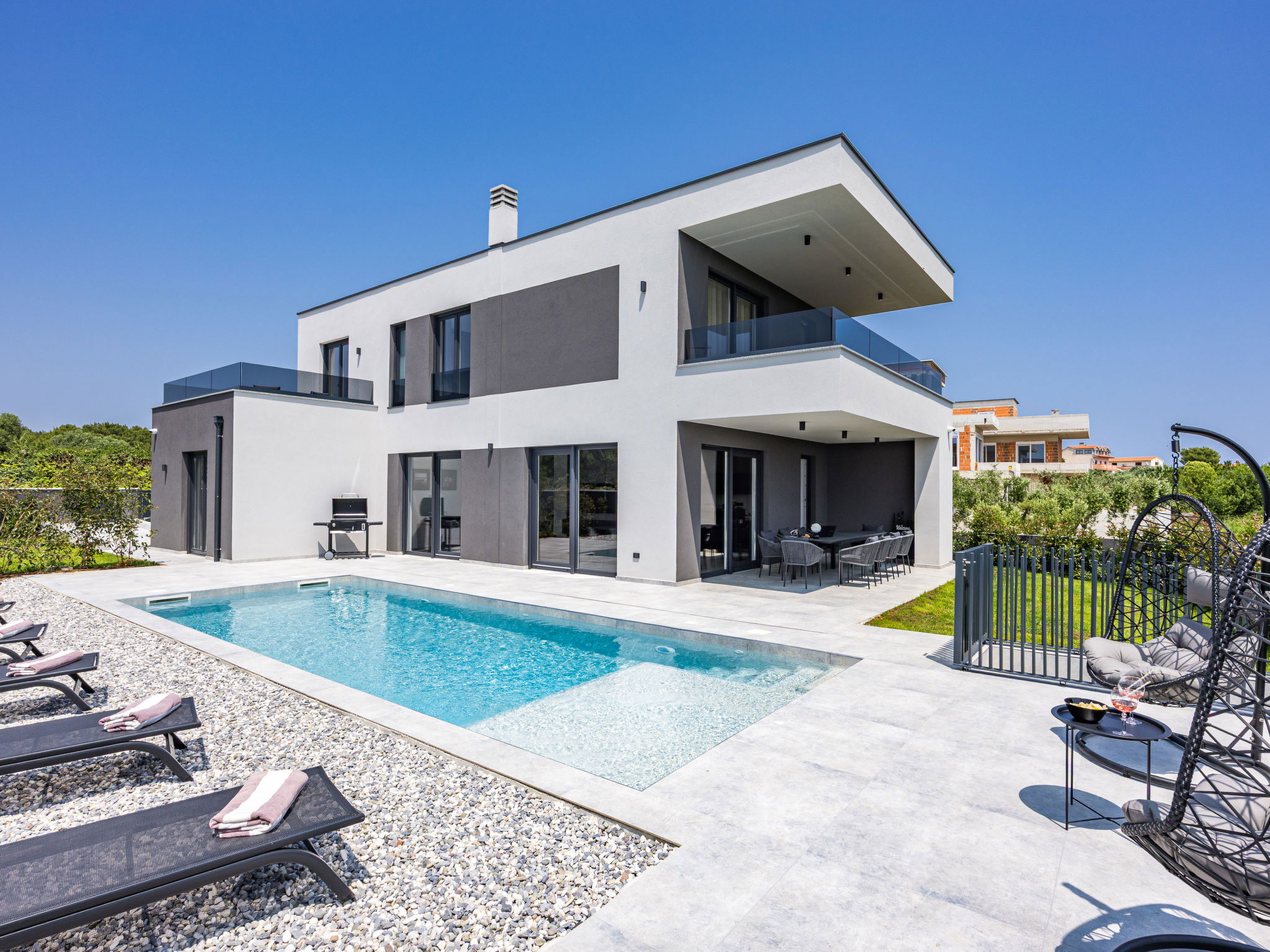 Premantura 11 km from Pula: Beautiful villa "Delecto", 2 storeys, built in 2025. 250 m from the centre of Premantura, in a sunny position, 500 m from the sea, 500 m from the beach. Private: property 600 m2 (fenced), garden with wildlife garden, swimming pool angular (8 x 4 m, depth 140 cm, seasonal availability: 04.Apr. - 10.Oct.) with internal staircase. Outdoor shower, terrace (15 m2), barbecue, pool maintenance by the owner/gardener. In the house: internet access, washing machine. Parking (for 3 cars) at the house on the premises. Shop 250 m, supermarket 4.5 km, restaurant 50 m, bus stop 220 m, pebble beach 2.5 km, rocky beach 500 m. Surf school 2.5 km, tennis 750 m, riding stable 10 km, walking paths from the house 100 m, cycle lane 150 m. Nearby attractions: Nature park Kamenjak 650 m. Groups of teenagers on request only. Neighbourhood highly sensitive to noise. Quietness and good behaviour expected. Swimming pool with hydromassage.